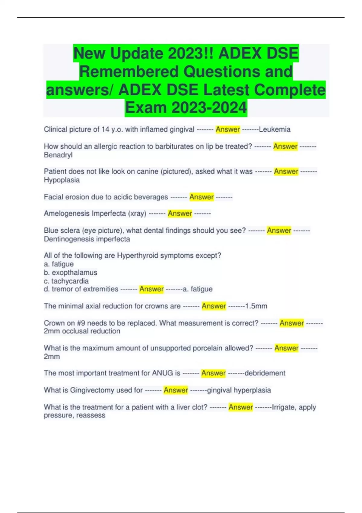 New Update 2023!! ADEX DSE Remembered Questions and answers/ ADEX DSE Latest Complete Exam Clinical picture of 14 y.o. with inflamed gingival ------- Answer -------Leukemia How should an allergic reaction to barbiturates on lip be treated? ------- Answer ------- Benadryl Patient does not like look on canine (pictured), asked what it was ------- Answer ------- Hypoplasia Facial erosion due to acidic beverages ------- Answer ------- Amelogenesis Imperfecta (xray) ------- Answer ------- Blue sclera (eye picture), what dental findings should you see? ------- Answer ------- Dentinogenesis imperfecta All of the following are Hyperthyroid symptoms except? a. fatigue b. exopthalamus c. tachycardia d. tremor of extremities ------- Answer -------a. fatigue