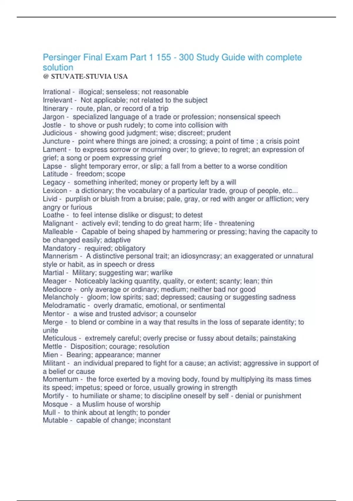 Persinger Final Exam Part 1 155 - 300 Study Guide with complete solution @ STUVATE-STUVIA USA Irrational - illogical; senseless; not reasonable Irrelevant - Not applicable; not related to the subject Itinerary - route, plan, or record of a trip Jargon - specialized language of a trade or profession; nonsensical speech Jostle - to shove or push rudely; to come into collision with Judicious - showing good judgment; wise; discreet; prudent Juncture - point where things are joined; a crossing; a point of time ; a crisis point Lament - to express sorrow or mourning over; to grieve; to regret; an expression of grief; a song or poem expressing grief Lapse - slight temporary error, or slip; a fall from a better to a worse condition Latitude - freedom; scope Legacy - something inherited; money or property left by a will Lexicon - a dictionary; the vocabulary of a particular trade, group of people, etc... Livid - purplish or bluish from a bruise; pale, gray, or red with anger or affliction; very angry or furious Loathe - to feel intense dislike or disgust; to detest Malignant - actively evil; tending to do great harm; life - threatening Malleable - Capable of being shaped by hammering or pressing; having the capacity to be changed easily; adaptive Mandatory - required; obligatory Mannerism - A distinctive personal trait; an idiosyncrasy; an exaggerated or unnatural style or habit, as in speech or dress Martial - Military; suggesting war; warlike Meager - Noticeably lacking quantity, quality, or extent; scanty; lean; thin Mediocre - only average or ordinary; medium; neither bad nor good Melancholy - gloom; low spirits; sad; depressed; causing or suggesting sadness Melodramatic - overly dramatic, emotional, or sentimental Mentor - a wise and trusted advisor; a counselor Merge - to blend or combine in a way that results in the loss of separate identity; to unite Meticulous - extremely careful; overly precise or fussy about details; painstaking Mettle - Disposition; courage; resolution Mien - Bearing; appearance; manner Militant - an individual prepared to fight for a cause; an activist; aggressive in support of a belief or cause Momentum - the force exerted by a moving body, found by multiplying its mass times its speed; impetus; speed or force, usually growing in strength Mortify - to humiliate or shame; to discipline oneself by self - denial or punishment Mosque - a Muslim house of worship Mull - to think about at length; to ponder Mutable - capable of change; inconstant Mystic - A person who believes that truth or God can best be known through spiritual insight; a religious seeker; mysterious Naive - lacking in sophistication; simple; inexperienced; revealing a lack of subtlety and insight Negligible - too small or unimportant to bother with; insignificant Notoriety - fame, usually in an unfavorable sense; a bad reputation Obligatory - required; compulsory; legally binding Obliterate - to destroy completely; to wipe out; to erase Oblivious - not conscious or aware; forgetful Odious - hateful; disgusting; detestable Opportune - suitable; advantageously timed Ornate - excessively adorned or ornamented; elaborate; fancy Ossify - to change into bone; to harden like bone; to become rigid; hardhearted, or opposed to change Painstaking - very careful; diligent; requiring great care; meticulous Palatable - fit to be eaten; pleasant tasting, pleasing Pallid - Abnormally pale; lacking in color, vitality, or interest Paradox - statement that may be true but seems to say contradictory things Paraphrase - a restatement of the meaning of a text or speech using other words; to state a meaning in other words Parody - an imitation (usually of a serious literary or artistic work) that ridicules the original; to imitate in order to ridicule; to mimic Pastoral - relating to a simple country way of life; relating to shepherds; rural Patent - a government document giving a person the right to profit from a an invention; to acquire such a document; evident; obvious Paternal - fatherly; inherited from or related through one's father Patriarch - founder/leader of a tribe or family; a respected old man Pauper - a person who is very poor, especially one dependent upon public charity Perceive - to become aware of or to understand by mean of the senses; to detect; to observe; to grasp the meaning of Perception - an observation, concept, or awareness gained by use of the senses; and understanding or impression of something; appreciation; discernment Perseverance - the act or habit of holding to a course of action or beliefs; persistence; steadfastness Personification - a figure of speech in which something non - human is given human qualities; a person or thing that perfectly represents an idea or quality Pertinent - related to the matter at hand; to the point; appropriate Pivotal - Relating to a pivot or rod on which something turns; crucial; vitally important Plausible - Appearing to be true; reasonable; seeming to be logical or correct Pompous - Overly dignified; self - important; ornate or high - flown Portly - Comfortably fat or stout; stately and dignified Posthumous - coming after death Postulate - to assume without proof; an assumption; a basic principle Potency - Strength; power Precarious - unsafe; insecure; uncertain; dangerous Prelude - an introductory section of a music; anything serving as an introduction Pretext - a false reason concealing a real one; an excuse Prevalent - widespread; in general use; having general acceptance Prolific - producing fruit or offspring abundantly; producing a great deal of something Prophetic - relating to someone or something that foretells events; predictive Protocol - the code prescribing formal etiquette and precedence for official ceremonies and dealings, as with diplomas and the military Protrude - to thrust forth; to project or stick out Proximity - nearness; closeness; a neighboring area Purge - to remove undesirable elements from; to rid; the removal of members of a governm