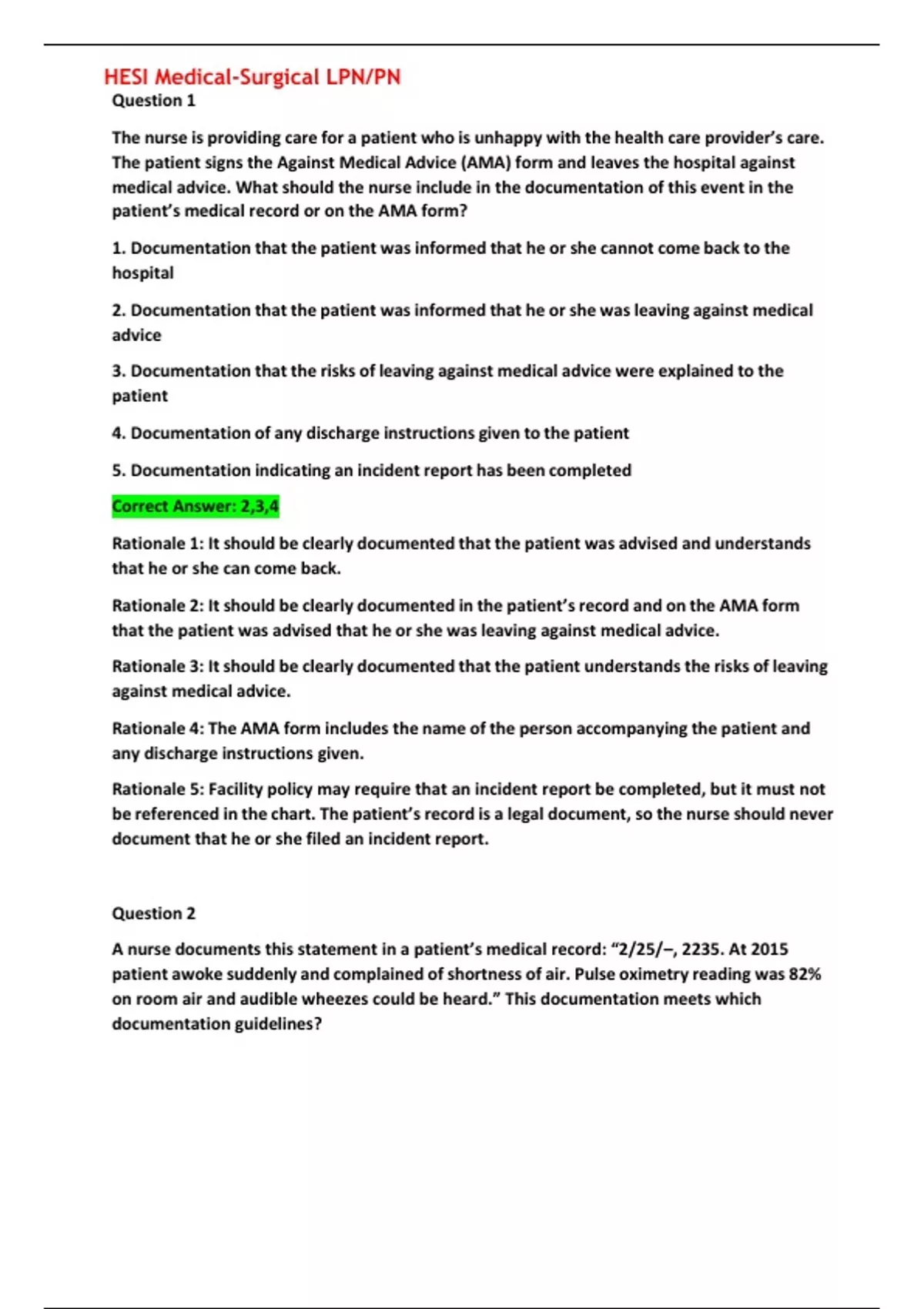 HESI Medical-Surgical LPN/PN Question 1 The nurse is providing care for a patient who is unhappy with the health care provider’s care. The patient signs the Against Medical Advice (AMA) form and leaves the hospital against medical advice. What should the nurse include in the documentation of this event in the patient’s medical record or on the AMA form? 1. Documentation that the patient was informed that he or she cannot come back to the hospital 2. Documentation that the patient was informed that he or she was leaving against medical advice 3. Documentation that the risks of leaving against medical advice were explained to the patient 4. Documentation of any discharge instructions given to the patient 5. Documentation indicating an incident report has been completed Correct Answer: 2,3,4 Rationale 1: It should be clearly documented that the patient was advised and understands that he or she can come back. Rationale 2: It should be clearly documented in the patient’s record and on the AMA form that the patient was advised that he or she was leaving against medical advice. Rationale 3: It should be clearly documented that the patient understands the risks of leaving against medical advice. Rationale 4: The AMA form includes the name of the person accompanying the patient and any discharge instructions given. Rationale 5: Facility policy may require that an incident report be completed, but it must not be referenced in the chart. The patient’s record is a legal document, so the nurse should never document that he or she filed an incident report. Question 2 A nurse documents this statement in a patient’s medical record: “2/25/–, 2235. At 2015 patient awoke suddenly and complained of shortness of air. Pulse oximetry reading was 82% on room air and audible wheezes could be heard.” This documentation meets which documentation guidelines? 1. Documentation is timely 2. Documentation is concise 3. Documentation is objective 4. Documentation includes date and time of entry 5. Documentation is complete and accurate Correct Answer: 2,3,4,5 Rationale 1: The nurse should document as soon as possible after an observation is made or care is provided. The entry was made in the patient’s medical record at least 2 hours after the patient complaint and should be labeled late entry. Rationale 2: This entry describes the situation fully but is concise. Rationale 3: The nurse describes factual events that can be seen, heard, smelled, or touched. It is important to be objective and avoid vague statements that are subjective. Rationale 4: Both the date and the time of the entry are documented. Rationale 5: The nurse should document only facts: what he or she can see, hear, and do. Question 3 A nurse documents the following in a patient’s medical record: “2/1/ , 1500. Patient appears weak and faint. Patient’s skin is moist and cool, vomited bright red blood with clots. Health care provider notified and order received to give 2 u of packed red blood cells if stat Hgb is < 8.0. Pain medication will be given.” This documentation meets which documentation principle? 1. Document objectively. 2. Do not document procedures in advance. 3. Use approved abbreviations. 4. Document changes in patient condition. Correct Answer: 4 Rationale 1: Documentation should be objective and avoid vague statements that are subjective. Only factual occurrences that can be seen, heard, smelled, or touched should be described. The use of the word “appears” is subjective and could be manipulated later should the treatment or judgment be challenged. Rationale 2: The nurse has documented that pain medication will be given. This is documenting in advance. Rationale 3: The Joint Commission has designated the inappropriateness of “u” as an abbreviation. “U” should be written out as “unit(s).” If unsure whether the abbreviation is correct, the nurse should spell out the word; “<” can be misinterpreted, so it should be spelled out as “less than.” Rationale 4: In general, employers as well as state, federal, and professional standards require documentation to include initial and ongoing assessments, any change in the patient’s condition, therapies given and patient response, patient teaching, and relevant statements by the patient. Question 4 A nursing unit has changed its documentation system to documenting by exception. How will this system save time? 1. It eliminates lengthy or repetitive documentation. 2. It allows flexibility and description in the documentation. 3. It allows the reader to easily locate information about a specific problem. 4. It allows for quick and easy retrieval of information. Correct Answer: 1 Rationale 1: Documenting by exception eliminates lengthy or repetitive documentation. Rationale 2: Flexible and descriptive documentation is an advantage of the narrative system. Rationale 3: PIE charting allows easy location of information about a specific problem. Rationale 4: The electronic health record allows for quick and easy retrieval of information. Question 5 A hospital is considering changing its documentation system to reduce the number of medication errors. Which system should the hospital investigate? 1. Problem, intervention, evaluation (PIE) system 2. Electronic medical record 3. Problem-oriented medical record 4. Narrative system Correct Answer: 2 Rationale 1: The PIE system consists of a list of the patient’s problems, interventions taken to alleviate the problems, and evaluation of the patient’s response to the interventions. This system does not have the specific benefit of reducing medication errors. Rationale 2: The electronic medical record decreases errors and allows for the reconciliation of the patient’s medications on admission, daily, and on discharge. Rationale 3: The five components of the problem-oriented medical record are baseline data, a problem list, a plan of care for each problem, multidisciplinary progress notes, and a discharge summary. T