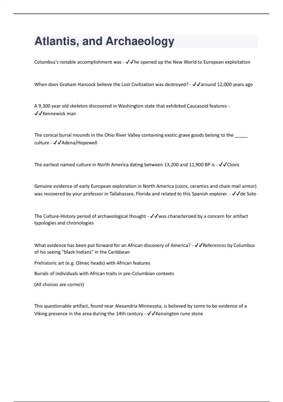 Columbus's notable accomplishment was - he opened up the New World to European exploitation When does Graham Hancock believe the Lost Civilization was destroyed? - around 12,000 years ago A 9,300 year old skeleton discovered in Washington state that exhibited Caucasoid features - Kennewick man The conical burial mounds in the Ohio River Valley containing exotic grave goods belong to the _____ culture - Adena/Hopewell The earliest named culture in North America dating between 13,200 and 11,900 BP is - Clovis Genuine evidence of early European exploration in North America (coins, ceramics and chain mail armor) was recovered by your professor in Tallahassee, Florida and related to this Spanish explorer. - de Soto The Culture-History period of archaeological thought - was characterized by a concern for artifact typologies and chronologies What evidence has been put forward for an African discovery of America? - References by Columbus of his seeing "black Indians" in the Caribbean Prehistoric art (e.g. Olmec heads) with African features Burials of individuals with African traits in pre-Columbian contexts (All choices are correct) This questionable artifact, found near Alexandria Minnesota, is believed by some to be evidence of a Viking presence in the area during the 14th century - Kensington rune stone