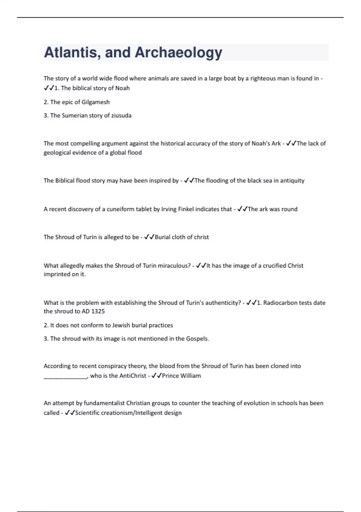 The story of a world wide flood where animals are saved in a large boat by a righteous man is found in - 1. The biblical story of Noah 2. The epic of Gilgamesh 3. The Sumerian story of ziusuda The most compelling argument against the historical accuracy of the story of Noah's Ark - The lack of geological evidence of a global flood The Biblical flood story may have been inspired by - The flooding of the black sea in antiquity A recent discovery of a cuneiform tablet by Irving Finkel indicates that - The ark was round The Shroud of Turin is alleged to be - Burial cloth of christ What allegedly makes the Shroud of Turin miraculous? - It has the image of a crucified Christ imprinted on it. What is the problem with establishing the Shroud of Turin's authenticity? - 1. Radiocarbon tests date the shroud to AD 1325 2. It does not conform to Jewish burial practices 3. The shroud with its image is not mentioned in the Gospels. According to recent conspiracy theory, the blood from the Shroud of Turin has been cloned into _____________, who is the AntiChrist - Prince William An attempt by fundamentalist Christian groups to counter the teaching of evolution in schools has been called - Scientific creationism/Intelligent design