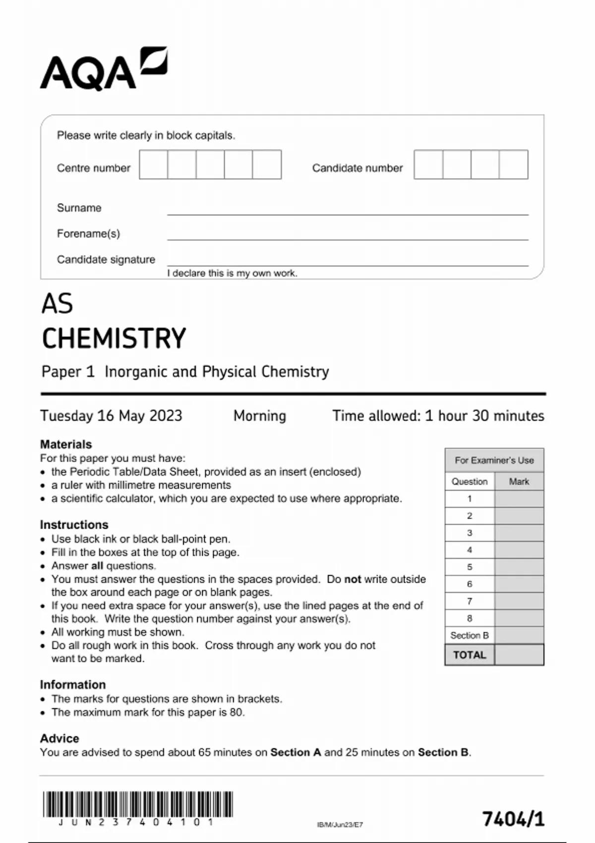AQA AS CHEMISTRY PAPER 1 2023 QUESTION PAPER (7404/1: Inorganic and Physical Chemistry)