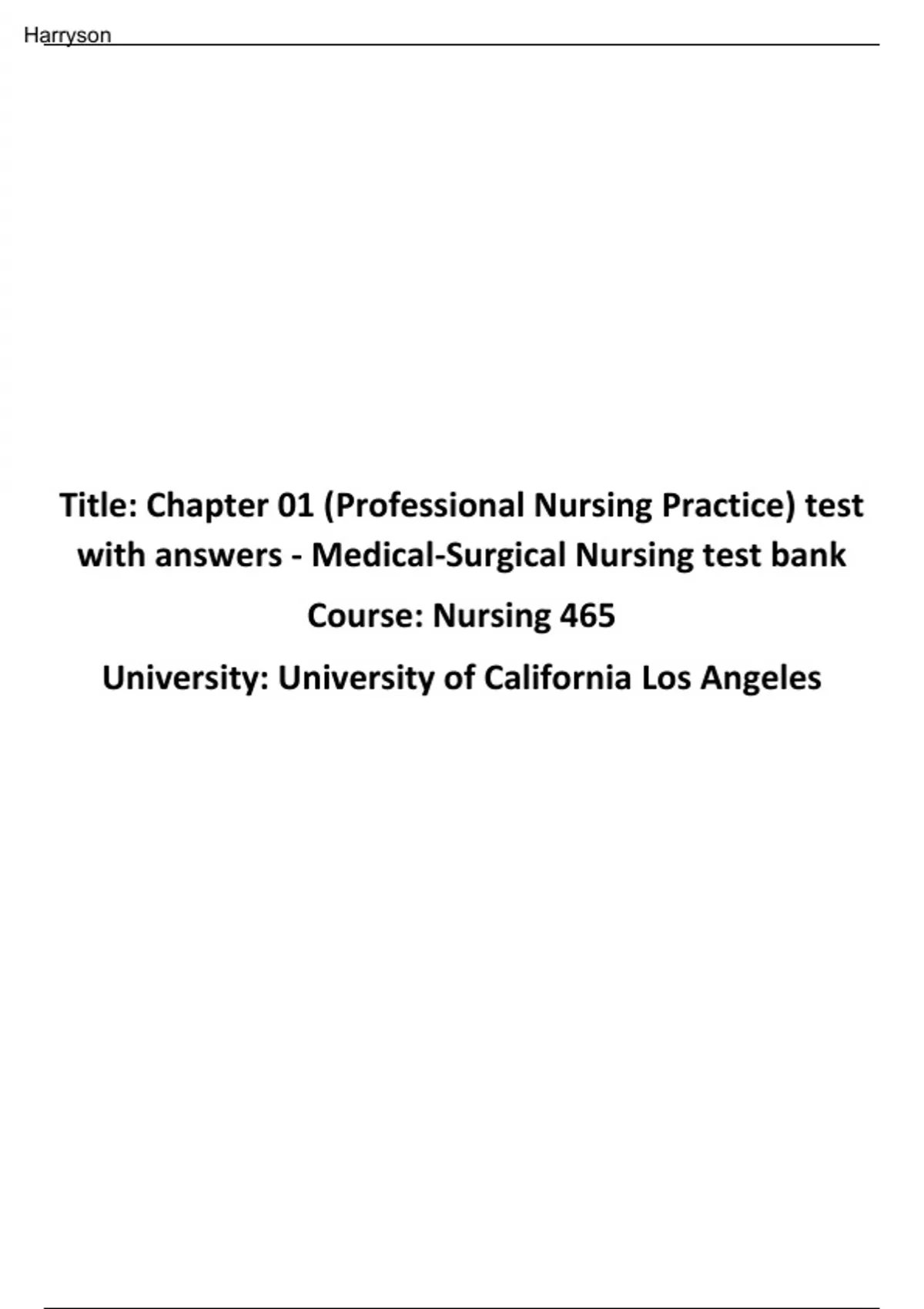 Chapter 01 (Professional Nursing Practice) test with answers - Medical-Surgical Nursing test banke: Chapter 01 (Professional Nursing Practice) test with answers - Medical-Surgical Nursing test bank Course: Nursing 465 University: University of California Los Angeles Harryson Chapter 1: Professional Nursing Practice Hinkle: Brunner & Suddarth's Textbook of Medical-Surgical Nursing, 15th Edition MULTIPLE CHOICE 1. A nurse has been offered a position on an obstetric unit and has learned that the unit offers therapeutic abortions, a procedure that contradicts the nurse's personal beliefs. What is the nurse's ethical obligation to these clients? A. The nurse should adhere to professional standards of practice and offer service to these clients. B. The nurse should make the choice to decline this position and pursue a different nursing role. C. The nurse should decline to care for the client’s considering abortion. D. The nurse should express alternatives to women considering terminating their pregnancy. ANS: B Rationale: To avoid facing the ethical dilemma of providing care that contradicts the nurse’s personal beliefs, the nurse should consider working in an area of nursing that would not pose this dilemma. The nurse should not provide care to the client because it is a conflict of personal values. The nurse should not deny care to these clients as this would be a breach in the Code of Ethics for nurses. If the client is not requesting information for alternatives to abortions, then the nurse should not be providing this information. PTS: 1 REF: p. 27 NAT: Client Needs: Safe, Effective Care Environment: Management of Care TOP: Chapter 1: Professional Nursing Practice KEY: Integrated Process: Caring BLM: Cognitive Level: Apply NOT: Multiple Choice 2. An 80-year-old client is admitted with a diagnosis of community-acquired pneumonia. During admission the client states, "I have a living will." What implication of this should the nurse recognize? A. This document is always honored, regardless of circumstances. B. This document specifies the client's wishes before hospitalization. C. This document is binding for the duration of the client's life. D. This document has been drawn up by the client's family to determine DNR status. ANS: B Rationale: A living will is one type of advance directive. In most situations, living wills are limited to situations in which the client's medical condition is deemed terminal. The other answers are incorrect because living wills are not always honored in every circumstance, they are not binding for the duration of the client's life, and they are not drawn up by the client's family. PTS: 1 REF: p. 29 NAT: Client Needs: Safe, Effective Care Environment: Management of Care TOP: Chapter 1: Professional Nursing Practice KEY: Integrated Process: Communication and Documentation BLM: Cognitive Level: Analyze NOT: Multiple Choice 3. A nurse has been providing ethical care for many years and is aware of the need to maintain the ethical principle of nonmaleficence. Which of the following actions would be considered a violation of this principle? A. Discussing a DNR order with a terminally ill client B. Assisting a semi-independent client with ADLs C. Refusing to administer pain medication as prescribed Test Bank - Brunner & Suddarth's Textbook of Medical-Surgical Nursing, 15e (Hinkle, 2022) lOMoARcPSD| Harryson D. Providing more care for one client than for another ANS: C Rationale: The duty not to inflict as well as prevent and remove harm is termed nonmaleficence. Discussing a DNR order with a terminally ill client and assisting a client with ADLs would not be considered contradictions to the nurse's duty of nonmaleficence. Some clients justifiably require more care than others. PTS: 1 REF: p. 25 NAT: Client Needs: Safe, Effective Care Environment: Management of Care TOP: Chapter 1: Professional Nursing Practice KEY: Integrated Process: Nursing Process BLM: Cognitive Level: Analyze NOT: Multiple Choice 4. A nurse has begun creating a client's plan of care shortly after the client's admission. The nurse knows that it is important that the wording of the chosen nursing diagnoses falls within the taxonomy of nursing. Which organization is responsible for developing the taxonomy of a nursing diagnosis? A. American Nurses Association (ANA) B. North American Nursing Diagnosis Association (NANDA) C. National League for Nursing (NLN) D. Joint Commission ANS: B Rationale: NANDA International is the official organization responsible for developing the taxonomy of nursing diagnoses and formulating nursing diagnoses acceptable for study. The ANA, NLN, and Joint Commission are not charged with the task of developing the taxonomy of nursing diagnoses. PTS: 1 REF: p. 15 NAT: Client Needs: Safe, Effective Care Environment: Management of Care TOP: Chapter 1: Professional Nursing Practice KEY: Integrated Process: Nursing Process BLM: Cognitive Level: Understand NOT: Multiple Choice 5. A medical nurse has obtained a new client's health history and has completed the admission assessment. The nurse followed this by documenting the results and creating a care plan for the client. Which of the following is the most important rationale for documenting the client's care? A. It provides continuity of care. B. It creates a teaching log for the family. C. It verifies appropriate staffing levels. D. It keeps the client fully informed. ANS: A Rationale: This record provides a means of communication among members of the health care team and facilitates coordinated planning and continuity of care. It serves as the legal and business record for a health care agency and for the professional staff members who are responsible for the client's care. Documentation is not primarily a teaching log; it does not verify staffing; and it is not intended to provide the client with information about treatments. PTS: 1 REF: p. 14 NAT: Client Needs: Safe, Effective Care Environment: Management of Care TOP: Chapter 1