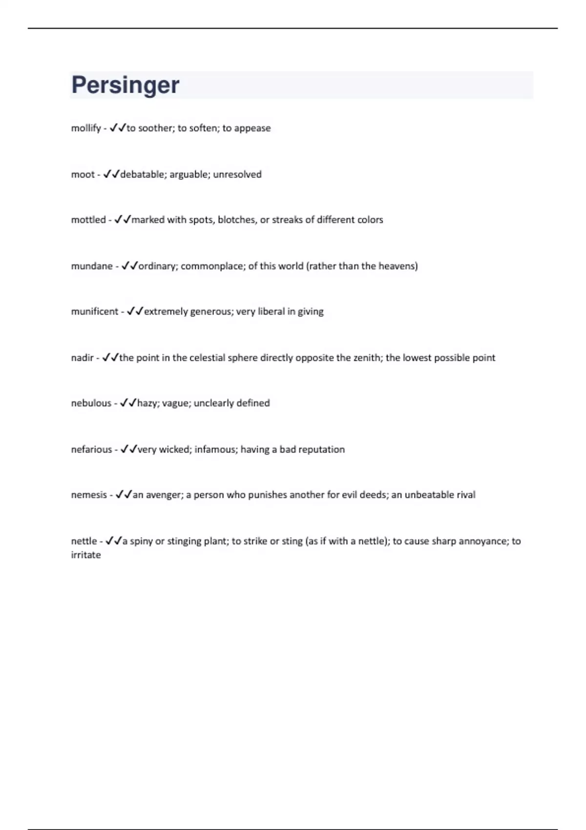 Persinger mollify - to soother; to soften; to appease moot - debatable; arguable; unresolved mottled - marked with spots, blotches, or streaks of different colors mundane - ordinary; commonplace; of this world (rather than the heavens) munificent - extremely generous; very liberal in giving nadir - the point in the celestial sphere directly opposite the zenith; the lowest possible point nebulous - hazy; vague; unclearly defined nefarious - very wicked; infamous; having a bad reputation nemesis - an avenger; a person who punishes another for evil deeds; an unbeatable rival nettle - a spiny or stinging plant; to strike or sting (as if with a nettle); to cause sharp annoyance; to irritate