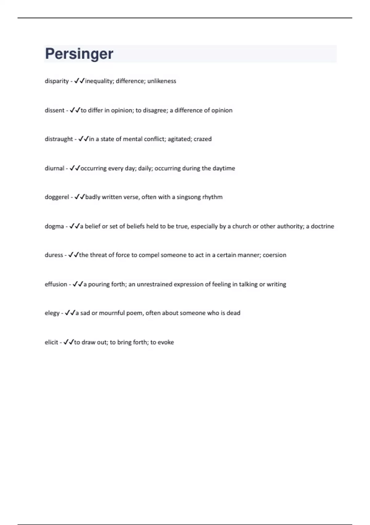 disparity - inequality; difference; unlikeness dissent - to differ in opinion; to disagree; a difference of opinion distraught - in a state of mental conflict; agitated; crazed diurnal - occurring every day; daily; occurring during the daytime doggerel - badly written verse, often with a singsong rhythm dogma - a belief or set of beliefs held to be true, especially by a church or other authority; a doctrine duress - the threat of force to compel someone to act in a certain manner; coersion effusion - a pouring forth; an unrestrained expression of feeling in talking or writing elegy - a sad or mournful poem, often about someone who is dead elicit - to draw out; to bring forth; to evoke