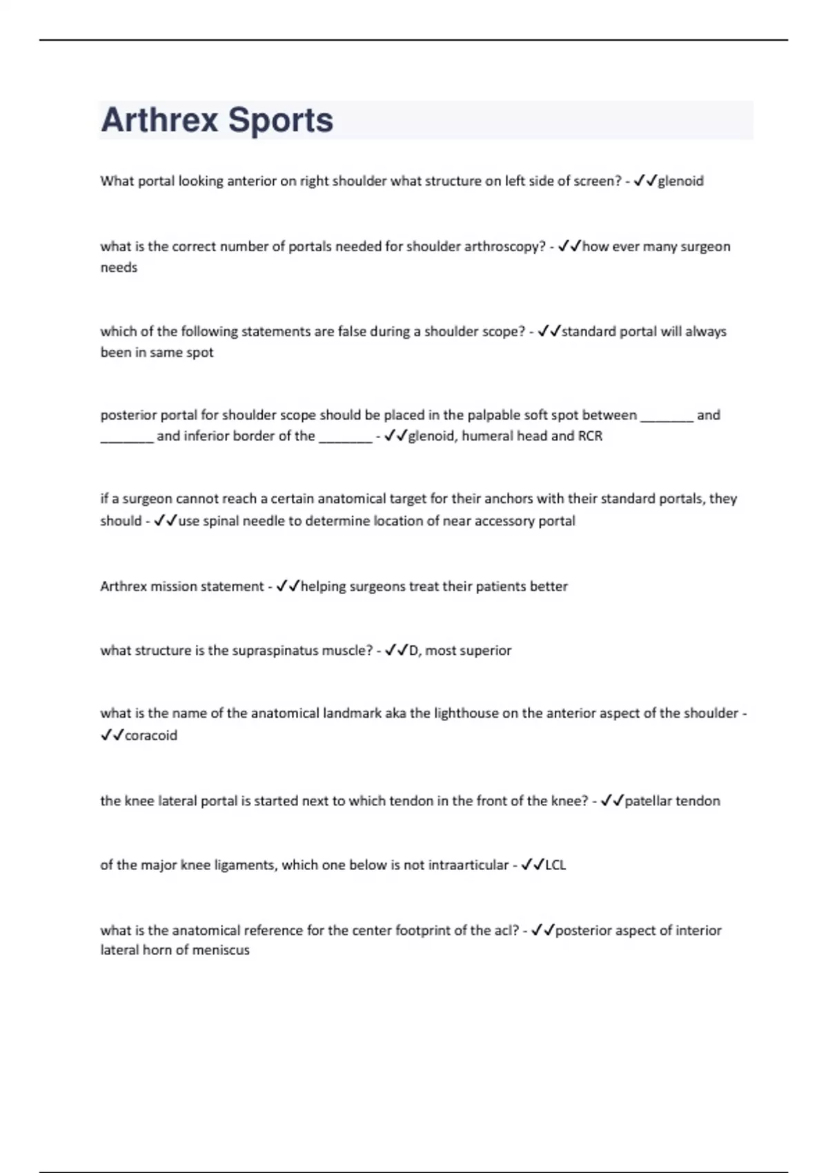 What portal looking anterior on right shoulder what structure on left side of screen? - glenoid what is the correct number of portals needed for shoulder arthroscopy? - how ever many surgeon needs which of the following statements are false during a shoulder scope? - standard portal will always been in same spot posterior portal for shoulder scope should be placed in the palpable soft spot between _______ and _______ and inferior border of the _______ - glenoid, humeral head and RCR if a surgeon cannot reach a certain anatomical target for their anchors with their standard portals, they should - use spinal needle to determine location of near accessory portal Arthrex mission statement - helping surgeons treat their patients better what structure is the supraspinatus muscle? - D, most superior what is the name of the anatomical landmark aka the lighthouse on the anterior aspect of the shoulder - coracoid the knee lateral portal is started next to which tendon in the front of the knee? - patellar tendon of the major knee ligaments, which one below is not intraarticular - LCL what is the anatomical reference for the center footprint of the acl? - posterior aspect of interior lateral horn of meniscus