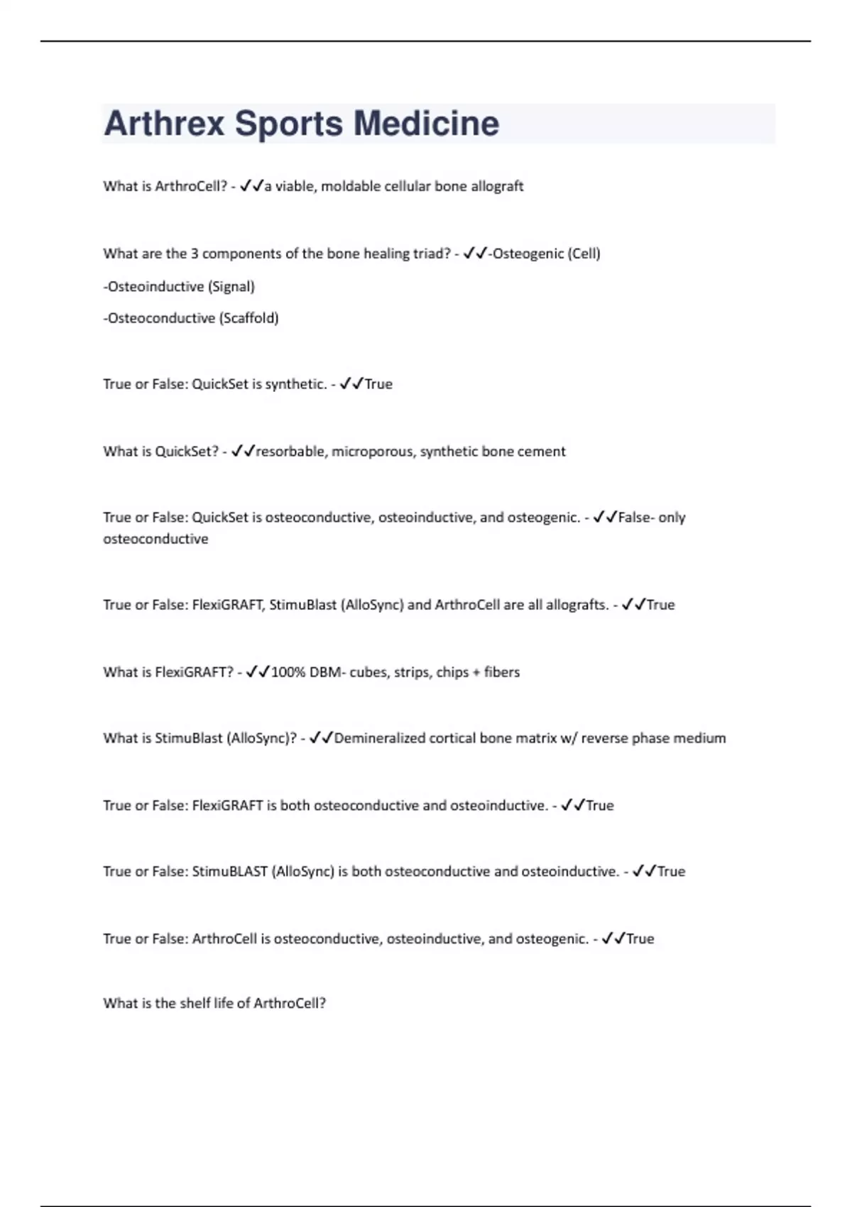 What is ArthroCell? - a viable, moldable cellular bone allograft What are the 3 components of the bone healing triad? - -Osteogenic (Cell) -Osteoinductive (Signal) -Osteoconductive (Scaffold) True or False: QuickSet is synthetic. - True What is QuickSet? - resorbable, microporous, synthetic bone cement True or False: QuickSet is osteoconductive, osteoinductive, and osteogenic. - False- only osteoconductive True or False: FlexiGRAFT, StimuBlast (AlloSync) and ArthroCell are all allografts. - True What is FlexiGRAFT? - 100% DBM- cubes, strips, chips + fibers What is StimuBlast (AlloSync)? - Demineralized cortical bone matrix w/ reverse phase medium True or False: FlexiGRAFT is both osteoconductive and osteoinductive. - True True or False: StimuBLAST (AlloSync) is both osteoconductive and osteoinductive. - True True or False: ArthroCell is osteoconductive, osteoinductive, and osteogenic. - True What is the shelf life of ArthroCell?