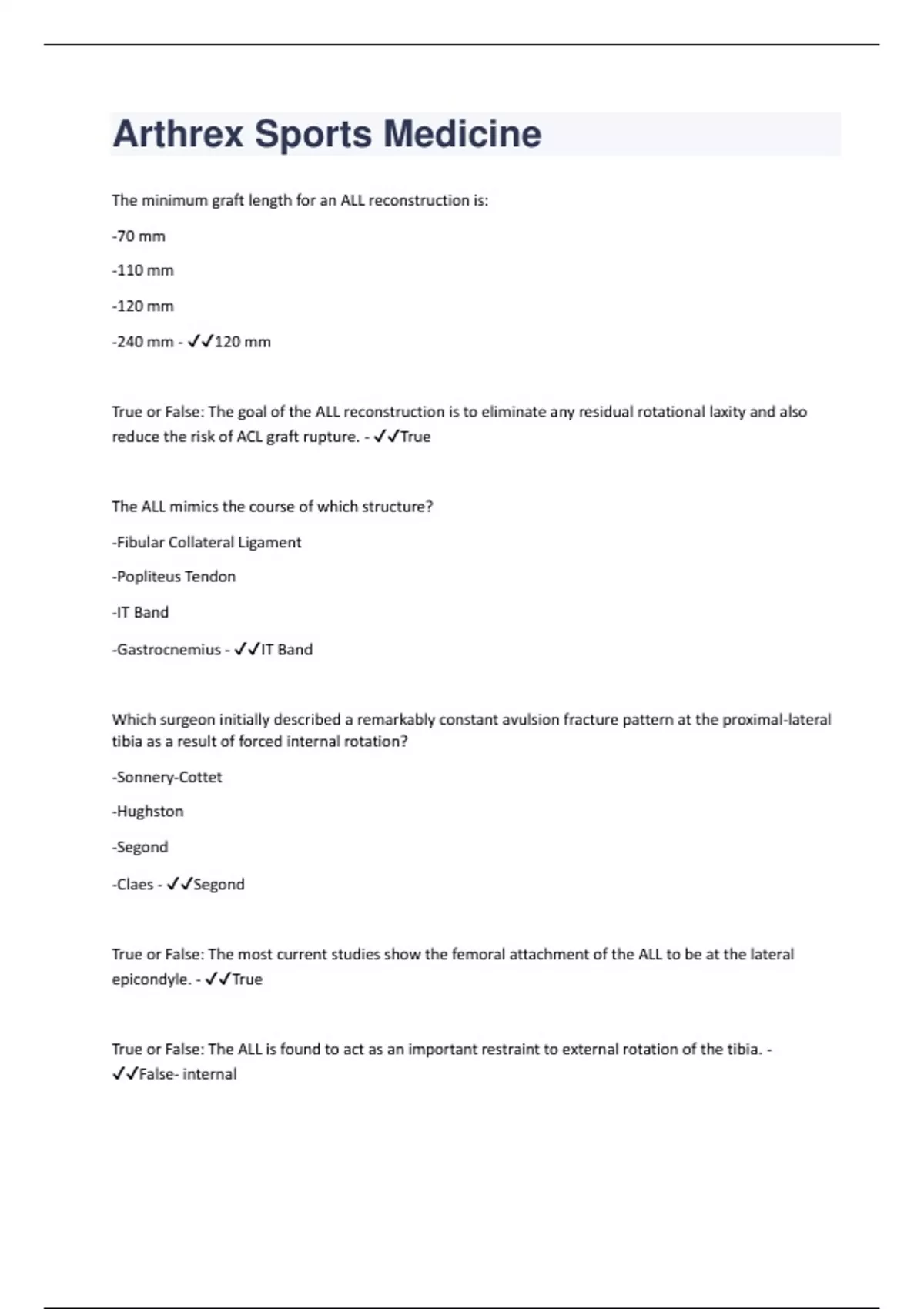 The minimum graft length for an ALL reconstruction is: -70 mm -110 mm -120 mm -240 mm - 120 mm True or False: The goal of the ALL reconstruction is to eliminate any residual rotational laxity and also reduce the risk of ACL graft rupture. - True The ALL mimics the course of which structure? -Fibular Collateral Ligament -Popliteus Tendon -IT Band -Gastrocnemius - IT Band Which surgeon initially described a remarkably constant avulsion fracture pattern at the proximal-lateral tibia as a result of forced internal rotation? -Sonnery-Cottet -Hughston -Segond -Claes - Segond True or False: The most current studies show the femoral attachment of the ALL to be at the lateral epicondyle. - True True or False: The ALL is found to act as an important restraint to external rotation of the tibia. - False- internal