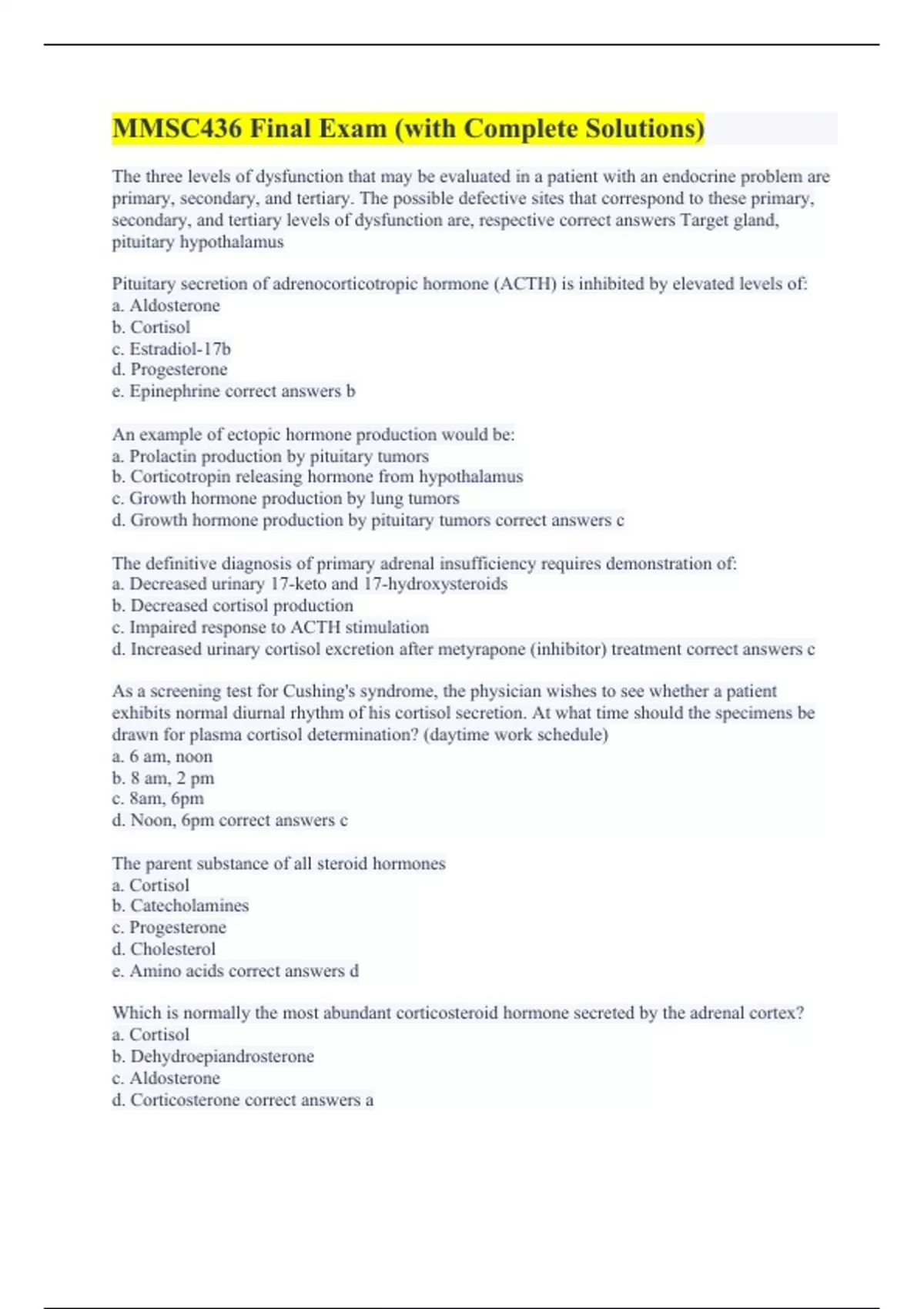 The three levels of dysfunction that may be evaluated in a patient with an endocrine problem are primary, secondary, and tertiary. The possible defective sites that correspond to these primary, secondary, and tertiary levels of dysfunction are, respective correct answers Target gland, pituitary hypothalamus Pituitary secretion of adrenocorticotropic hormone (ACTH) is inhibited by elevated levels of: a. Aldosterone b. Cortisol c. Estradiol-17b d. Progesterone e. Epinephrine correct answers b An example of ectopic hormone production would be: a. Prolactin production by pituitary tumors b. Corticotropin releasing hormone from hypothalamus c. Growth hormone production by lung tumors d. Growth hormone production by pituitary tumors correct answers c The definitive diagnosis of primary adrenal insufficiency requires demonstration of: a. Decreased urinary 17-keto and 17-hydroxysteroids b. Decreased cortisol production c. Impaired response to ACTH stimulation d. Increased urinary cortisol excretion after metyrapone (inhibitor) treatment correct answers c As a screening test for Cushing's syndrome, the physician wishes to see whether a patient exhibits normal diurnal rhythm of his cortisol secretion. At what time should the specimens be drawn for plasma cortisol determination? (daytime work schedule) a. 6 am, noon b. 8 am, 2 pm c. 8am, 6pm d. Noon, 6pm correct answers c The parent substance of all steroid hormones a. Cortisol b. Catecholamines c. Progesterone d. Cholesterol e. Amino acids correct answers d Which is normally the most abundant corticosteroid hormone secreted by the adrenal cortex? a. Cortisol b. Dehydroepiandrosterone c. Aldosterone d. Corticosterone correct answers a