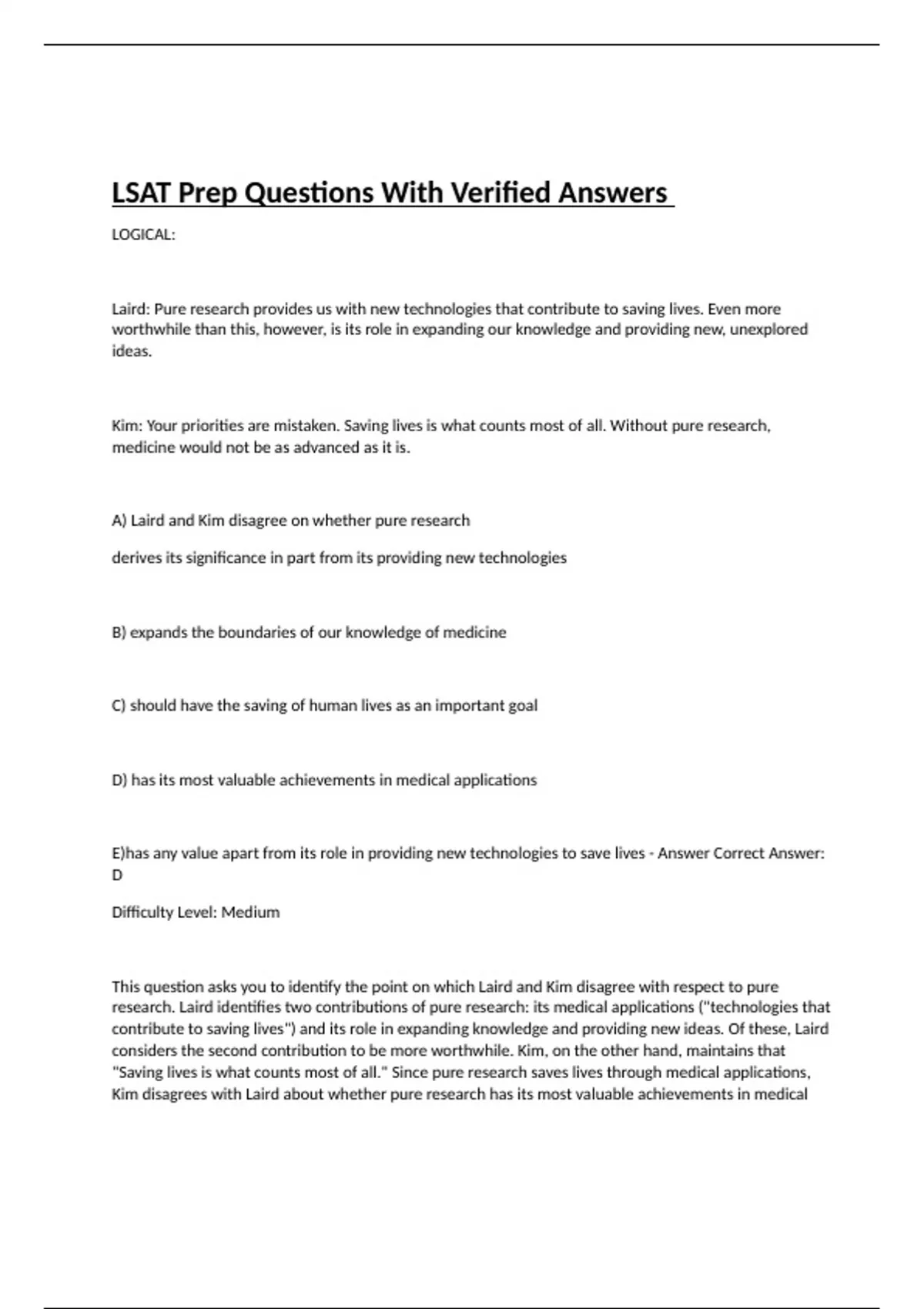 LOGICAL: Laird: Pure research provides us with new technologies that contribute to saving lives. Even more worthwhile than this, however, is its role in expanding our knowledge and providing new, unexplored ideas. Kim: Your priorities are mistaken. Saving lives is what counts most of all. Without pure research, medicine would not be as advanced as it is. A) Laird and Kim disagree on whether pure research derives its significance in part from its providing new technologies B) expands the boundaries of our knowledge of medicine C) should have the saving of human lives as an important goal D) has its most valuable achievements in medical applications E)has any value apart from its role in providing new technologies to save lives - Answer Correct Answer: D Difficulty Level: Medium This question asks you to identify the point on which Laird and Kim disagree with respect to pure research. Laird identifies two contributions of pure research: its medical applications ("technologies that contribute to saving lives") and its role in expanding knowledge and providing new ideas. Of these, Laird considers the second contribution to be more worthwhile. Kim, on the other hand, maintains that "Saving lives is what counts most of all." Since pure research saves lives through medical applications, Kim disagrees with Laird about whether pure research has its most valuable achievements in medical applications. The correct response, therefore, is (D). Response (A) is incorrect since we can determine, based on their statements, that Laird and Kim agree that pure research "derives its significance in part from its providing new technologies." Laird explicitly cites the value of pure research with respect to providing new technologies. Kim indicates agreement with (A), at least in the case of medical technologies, by asserting that "Without pure research, medicine would not be as advanced as it is." Response (B) is incorrect since we can determine, based on their statements, that Laird and Kim would likely agree that pure research "expands the boundaries of our knowledge of medicine." Laird notes that pure research provides us with new technologies that have medical applications. Kim points out that "Without pure research, medicine would not be as advanced as it is." Response (C) is incorrect. Kim indicates agreement that pure research "should have the saving of human lives as an important goal" since Kim's position is that "Saving lives is what counts most of all." Since Laird cites the saving of lives as one way in which pure research is worthwhile or valuable, Laird also indicates agreement that pure research "should have the saving of human lives as an important goal," although Laird indicates that expanding knowledge and providing new ideas should be an even more important goal of pure research. The same activity can of course have more than one goal. Response (E) is incorrect. Laird clearly agrees that pure research has value "apart from its role in providing new technologies to save lives," given that Laird explicitly cites a second way in which pure research is valuable. However, nothing in what Kim says suggests disagreement with (E). Kim's position is that the greatest value of pure research is its role in providing new technologies to save lives. We cannot infer from this that Kim believes this role to be the only value of pure research. This question was of medium difficulty, based on the number of test takers who answered it correctly when it appeared on the LSAT. LOGICAL: Executive: We recently ran a set of advertisements in the print version of a travel magazine and on that magazine's website. We were unable to get any direct information about consumer response to the print ads. However, we found that consumer response to the ads on the website was much more limited than is typical for website ads. We concluded that consumer response to the print ads was probably below par as well. The executive's reasoning does which one of the following? A) bases a prediction of the intensity of a phenomenon on information about the intensity of that phenomenon's cause B) uses information about the typical frequency of events of a general kind to draw a conclusion about the probability of a particular event of that kind C) infers a statistical generalization from claims about a large number of specific instances D) uses a case in which direct evidence is available to draw a conclusion about an analogous case in which direct evidence is unavailable E) bases a prediction about future events on facts about recent comparable events - Answer Correct Answer: D Difficulty Level: Easy This question asks you to identify how the executive's reasoning proceeds. The ads discussed by the executive appeared in two places—in a magazine and on the magazine's website. Some information is available concerning the effect of the website ads on consumers, but no consumer response information is available about the print ads. The executive's remarks suggest that the ads that appeared in print and on the website were basically the same, or very similar. The executive reasoned that information about the effect of the website ads could be used as evidence for an inference about how the print ads likely performed. The executive thus used the analogy between the print ads and the website ads to infer something about the print ads. (D), therefore, is the correct response. Response (A) is incorrect. The executive's conclusion about the likely consumer response to the print ads does not constitute a prediction, but rather a judgment about events that have already transpired. Moreover, the executive's conclusion is not based on any reasoning about the cause of the consumer response to the print ads. Response (B) is incorrect. The executive does conclude that certain events are likely to have transpired on the basis of what was known to have transpired in a similar case, but no distinction can be made in the executive's argument between eve