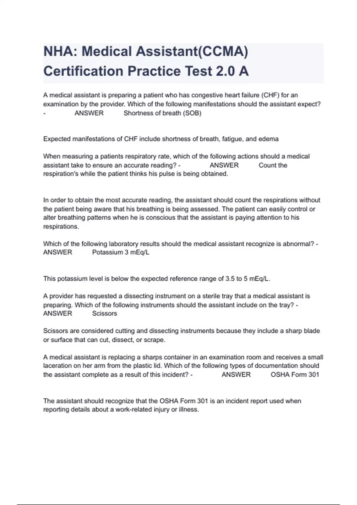 NHA: Medical Assistant(CCMA) Certification Practice Test 2.0 A WITH A+ SOLUTION GUIDE SUMMER 2023