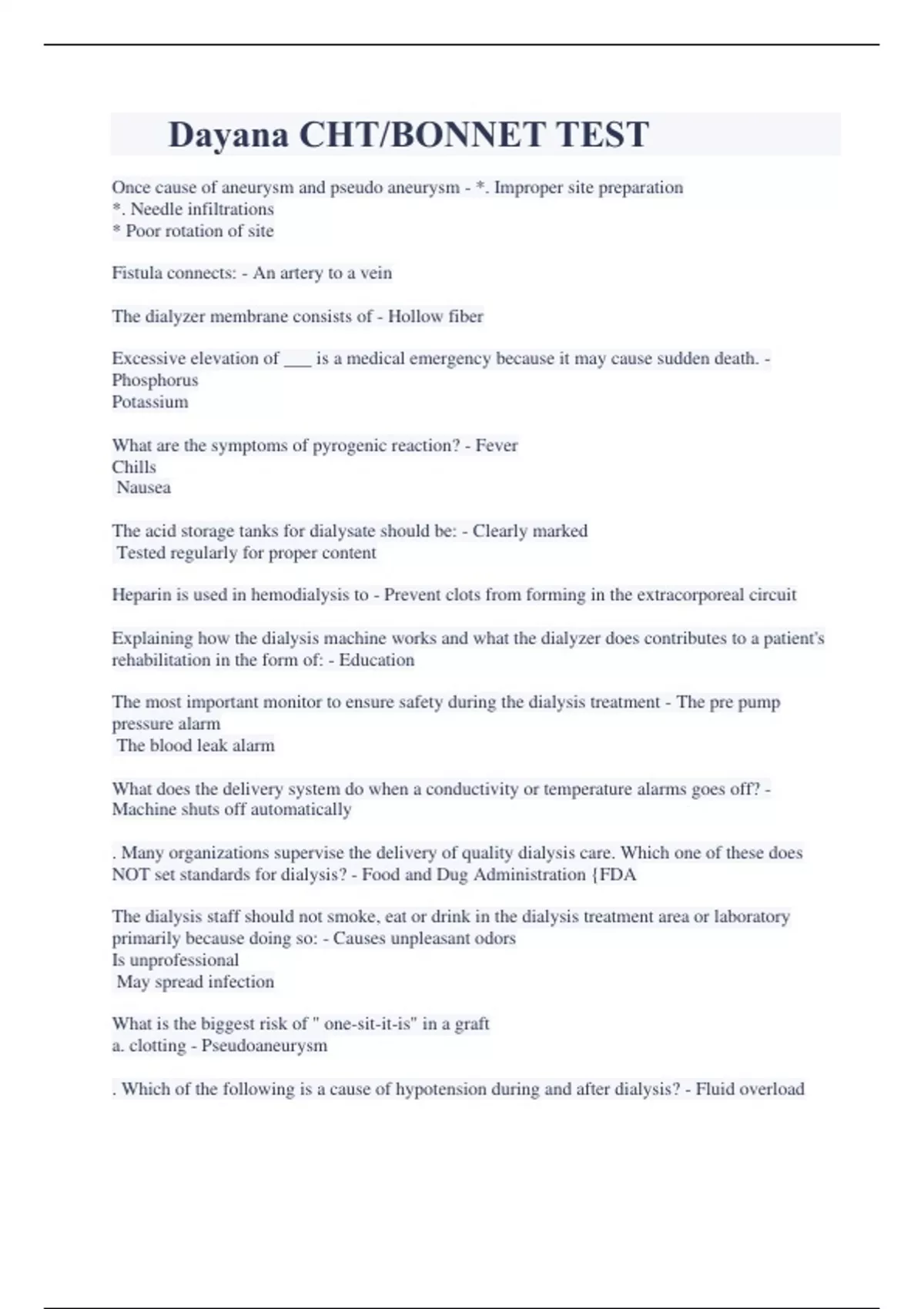 Dayana CHT/BONNET TEST Once cause of aneurysm and pseudo aneurysm - *. Improper site preparation *. Needle infiltrations * Poor rotation of site Fistula connects: - An artery to a vein The dialyzer membrane consists of - Hollow fiber Excessive elevation of ___ is a medical emergency because it may cause sudden death. - Phosphorus Potassium What are the symptoms of pyrogenic reaction? - Fever Chills Nausea The acid storage tanks for dialysate should be: - Clearly marked Tested regularly for proper content Heparin is used in hemodialysis to - Prevent clots from forming in the extracorporeal circuit Explaining how the dialysis machine works and what the dialyzer does contributes to a patient's rehabilitation in the form of: - Education The most important monitor to ensure safety during the dialysis treatment - The pre pump pressure alarm The blood leak alarm What does the delivery system do when a conductivity or temperature alarms goes off? - Machine shuts off automatically . Many organizations supervise the delivery of quality dialysis care. Which one of these does NOT set standards for dialysis? - Food and Dug Administration {FDA The dialysis staff should not smoke, eat or drink in the dialysis treatment area or laboratory primarily because doing so: - Causes unpleasant odors Is unprofessional May spread infection What is the biggest risk of " one-sit-it-is" in a graft a. clotting - Pseudoaneurysm . Which of the following is a cause of hypotension during and after dialysis? - Fluid overload What are the two types of ultrafiltration system: - TMP and UFR Why are synthetic dialysis membranes more biocompatible? - They mimic the human body. They are highly adsorptive 17. How are dialysis clinics paid by Medicare for Dualysis treatments? - Prospective payment system bundle What does " pay for performance" means? - Clinics that don't meet certain quality standards will have their payments cut.