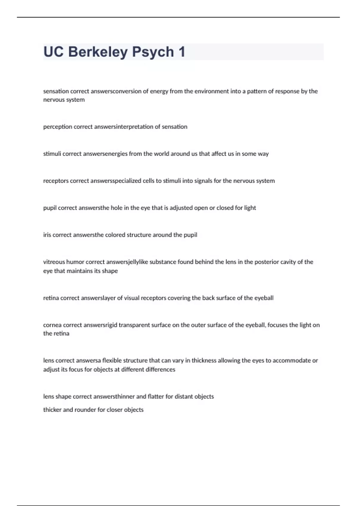 sensation correct answersconversion of energy from the environment into a pattern of response by the nervous system perception correct answersinterpretation of sensation stimuli correct answersenergies from the world around us that affect us in some way receptors correct answersspecialized cells to stimuli into signals for the nervous system pupil correct answersthe hole in the eye that is adjusted open or closed for light iris correct answersthe colored structure around the pupil vitreous humor correct answersjellylike substance found behind the lens in the posterior cavity of the eye that maintains its shape retina correct answerslayer of visual receptors covering the back surface of the eyeball cornea correct answersrigid transparent surface on the outer surface of the eyeball, focuses the light on the retina