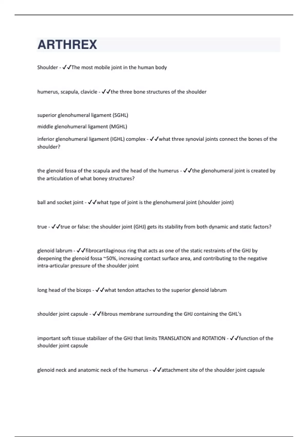 Shoulder - The most mobile joint in the human body humerus, scapula, clavicle - the three bone structures of the shoulder superior glenohumeral ligament (SGHL) middle glenohumeral ligament (MGHL) inferior glenohumeral ligament (IGHL) complex - what three synovial joints connect the bones of the shoulder? the glenoid fossa of the scapula and the head of the humerus - the glenohumeral joint is created by the articulation of what boney structures? ball and socket joint - what type of joint is the glenohumeral joint (shoulder joint) true - true or false: the shoulder joint (GHJ) gets its stability from both dynamic and static factors? glenoid labrum - fibrocartilaginous ring that acts as one of the static restraints of the GHJ by deepening the glenoid fossa ~50%, increasing contact surface area, and contributing to the negative intra-articular pressure of the shoulder joint long head of the biceps - what tendon attaches to the superior glenoid labrum shoulder joint capsule - fibrous membrane surrounding the GHJ containing the GHL's important soft tissue stabilizer of the GHJ that limits TRANSLATION and ROTATION - function of the shoulder joint capsule glenoid neck and anatomic neck of the humerus - attachment site of the shoulder joint capsule