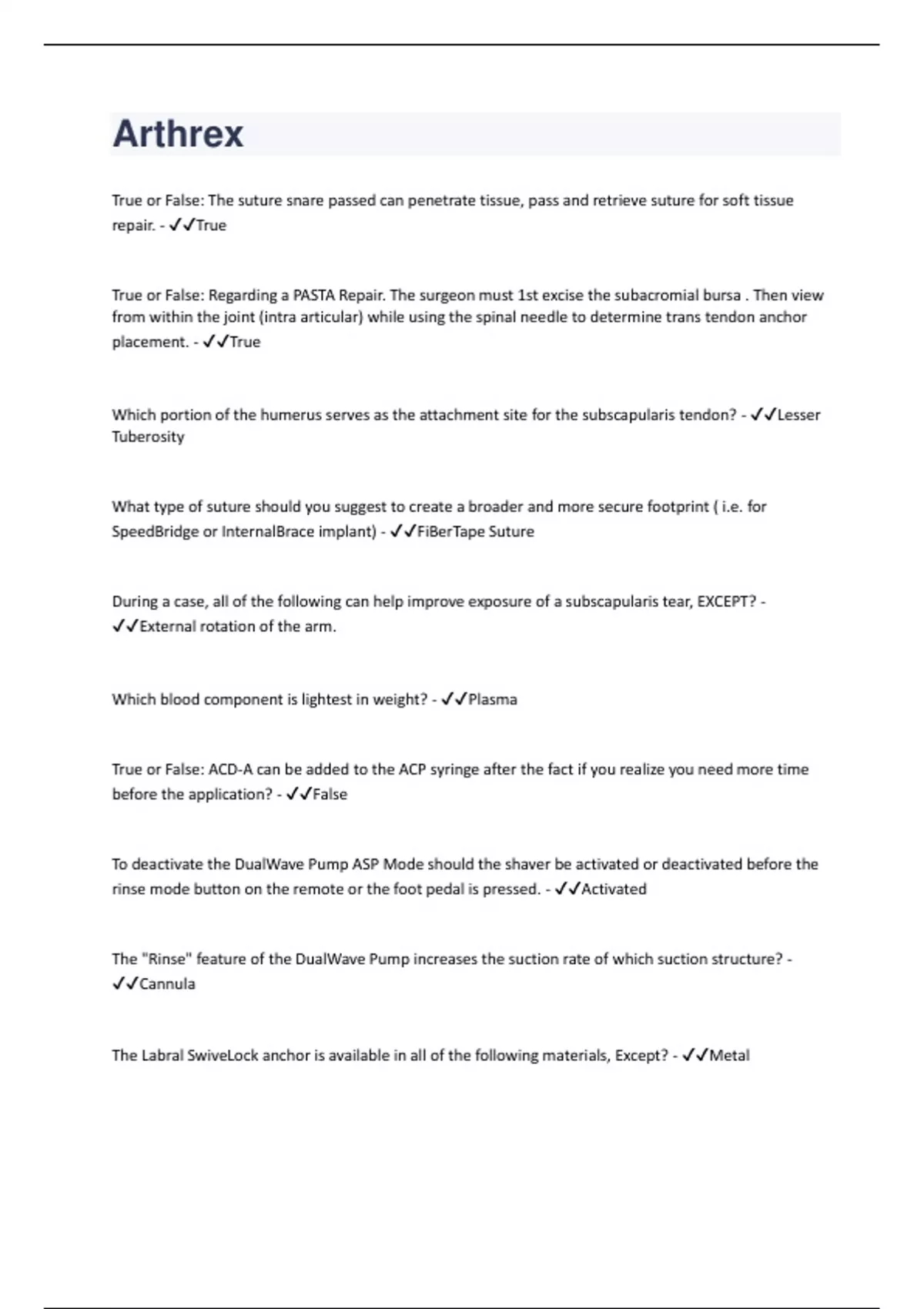 True or False: The suture snare passed can penetrate tissue, pass and retrieve suture for soft tissue repair. - True True or False: Regarding a PASTA Repair. The surgeon must 1st excise the subacromial bursa . Then view from within the joint (intra articular) while using the spinal needle to determine trans tendon anchor placement. - True Which portion of the humerus serves as the attachment site for the subscapularis tendon? - Lesser Tuberosity What type of suture should you suggest to create a broader and more secure footprint ( i.e. for SpeedBridge or InternalBrace implant) - FiBerTape Suture During a case, all of the following can help improve exposure of a subscapularis tear, EXCEPT? - External rotation of the arm. Which blood component is lightest in weight? - Plasma True or False: ACD-A can be added to the ACP syringe after the fact if you realize you need more time before the application? - False To deactivate the DualWave Pump ASP Mode should the shaver be activated or deactivated before the rinse mode button on the remote or the foot pedal is pressed. - Activated The "Rinse" feature of the DualWave Pump increases the suction rate of which suction structure? - Cannula The Labral SwiveLock anchor is available in all of the following materials, Except? - Metal