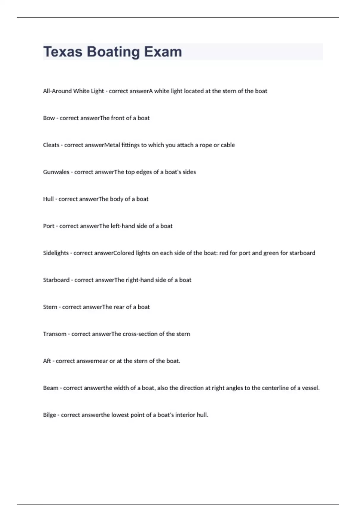 All-Around White Light - correct answerA white light located at the stern of the boat Bow - correct answerThe front of a boat Cleats - correct answerMetal fittings to which you attach a rope or cable Gunwales - correct answerThe top edges of a boat's sides Hull - correct answerThe body of a boat Port - correct answerThe left-hand side of a boat Sidelights - correct answerColored lights on each side of the boat: red for port and green for starboard Starboard - correct answerThe right-hand side of a boat Stern - correct answerThe rear of a boat Transom - correct answerThe cross-section of the stern Aft - correct answernear or at the stern of the boat.