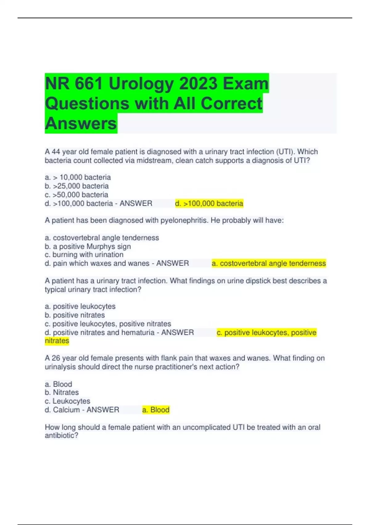 NR 661 Urology 2023 Exam Questions with All Correct Answers A 44 year old female patient is diagnosed with a urinary tract infection (UTI). Which bacteria count collected via midstream, clean catch supports a diagnosis of UTI? a. 10,000 bacteria b. 25,000 bacteria c. 50,000 bacteria d. 100,000 bacteria - ANSWER d. 100,000 bacteria A patient has been diagnosed with pyelonephritis. He probably will have: a. costovertebral angle tenderness b. a positive Murphys sign c. burning with urination d. pain which waxes and wanes - ANSWER a. costovertebral angle tenderness A patient has a urinary tract infection. What findings on urine dipstick best describes a typical urinary tract infection? a. positive leukocytes b. positive nitrates c. positive leukocytes, positive nitrates d. positive nitrates and hematuria - ANSWER c. positive leukocytes, positive nitrates A 26 year old female presents with flank pain that waxes and wanes. What finding on urinalysis should direct the nurse practitioner's next action? a. Blood b. Nitrates c. Leukocytes d. Calcium - ANSWER a. Blood How long should a female patient with an uncomplicated UTI be treated with an oral antibiotic? a. 1 day b. 3 days c. 5 days d. 7 days - ANSWER b. 3 days An adolescent has suspected varicocele. He has dull scrotal pain that is relieved by: a. standing b. recumbency c. having a bowel movement d. elevation of the testicle - ANSWER b. recumbency
