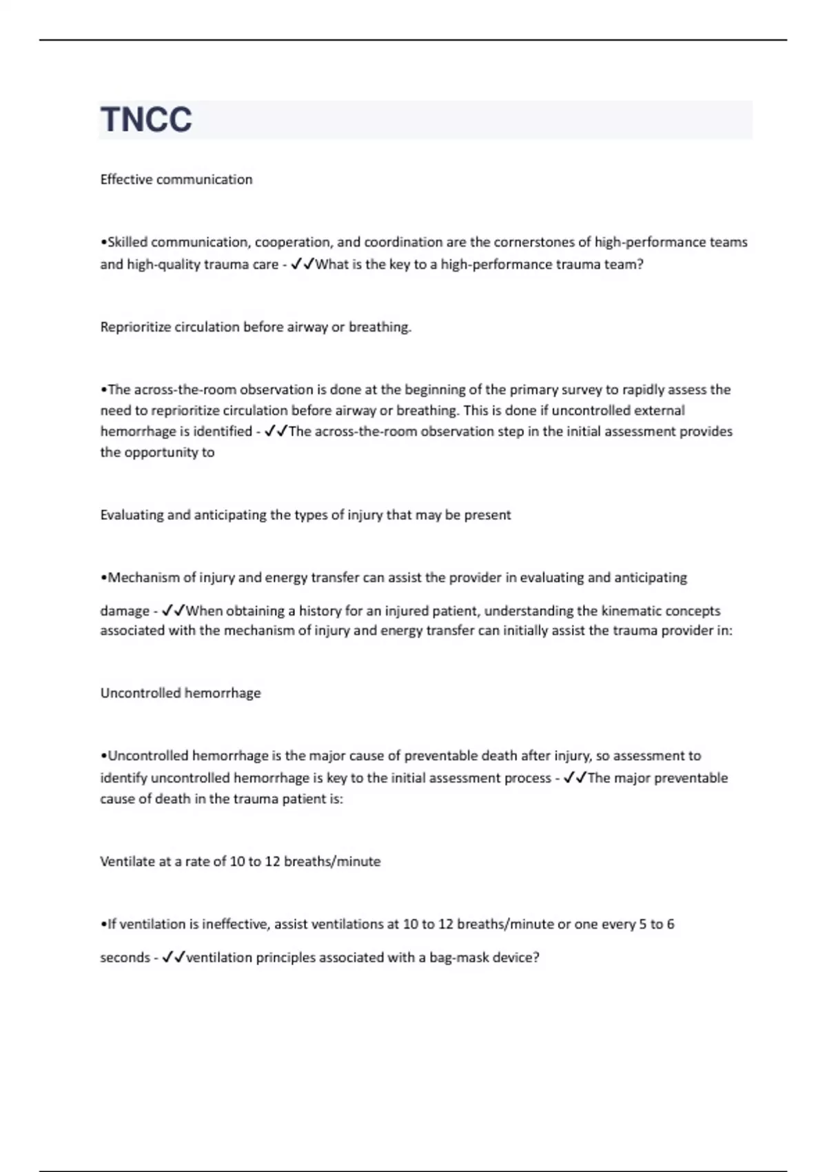 Effective communication •Skilled communication, cooperation, and coordination are the cornerstones of high-performance teams and high-quality trauma care - What is the key to a high-performance trauma team? Reprioritize circulation before airway or breathing. •The across-the-room observation is done at the beginning of the primary survey to rapidly assess the need to reprioritize circulation before airway or breathing. This is done if uncontrolled external hemorrhage is identified - The across-the-room observation step in the initial assessment provides the opportunity to Evaluating and anticipating the types of injury that may be present •Mechanism of injury and energy transfer can assist the provider in evaluating and anticipating damage - When obtaining a history for an injured patient, understanding the kinematic concepts associated with the mechanism of injury and energy transfer can initially assist the trauma provider in: Uncontrolled hemorrhage •Uncontrolled hemorrhage is the major cause of preventable death after injury, so assessment to identify uncontrolled hemorrhage is key to the initial assessment process - The major preventable cause of death in the trauma patient is: Ventilate at a rate of 10 to 12 breaths/minute •If ventilation is ineffective, assist ventilations at 10 to 12 breaths/minute or one every 5 to 6 seconds - ventilation principles associated with a bag-mask device?