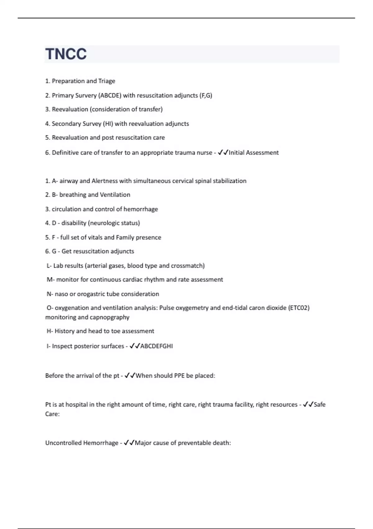 1. Preparation and Triage 2. Primary Survery (ABCDE) with resuscitation adjuncts (F,G) 3. Reevaluation (consideration of transfer) 4. Secondary Survey (HI) with reevaluation adjuncts 5. Reevaluation and post resuscitation care 6. Definitive care of transfer to an appropriate trauma nurse - Initial Assessment 1. A- airway and Alertness with simultaneous cervical spinal stabilization 2. B- breathing and Ventilation 3. circulation and control of hemorrhage 4. D - disability (neurologic status) 5. F - full set of vitals and Family presence 6. G - Get resuscitation adjuncts L- Lab results (arterial gases, blood type and crossmatch) M- monitor for continuous cardiac rhythm and rate assessment N- naso or orogastric tube consideration O- oxygenation and ventilation analysis: Pulse oxygemetry and end-tidal caron dioxide (ETC02) monitoring and capnopgraphy H- History and head to toe assessment I- Inspect posterior surfaces - ABCDEFGHI Before the arrival of the pt - When should PPE be placed: Pt is at hospital in the right amount of time, right care, right trauma facility, right resources - Safe Care: Uncontrolled Hemorrhage - Major cause of preventable death: