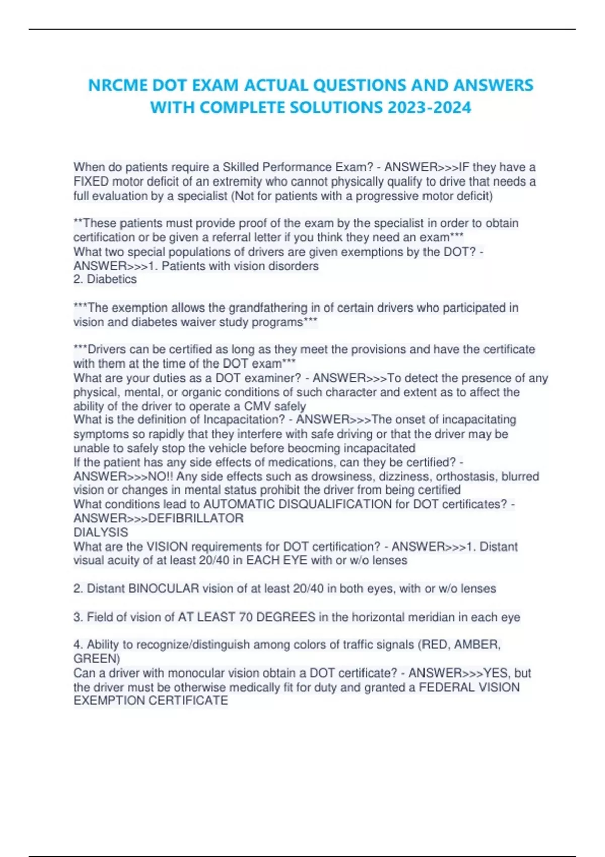 NRCME DOT EXAM ACTUAL QUESTIONS AND ANSWERS WITH COMPLETE SOLUTIONS 2023