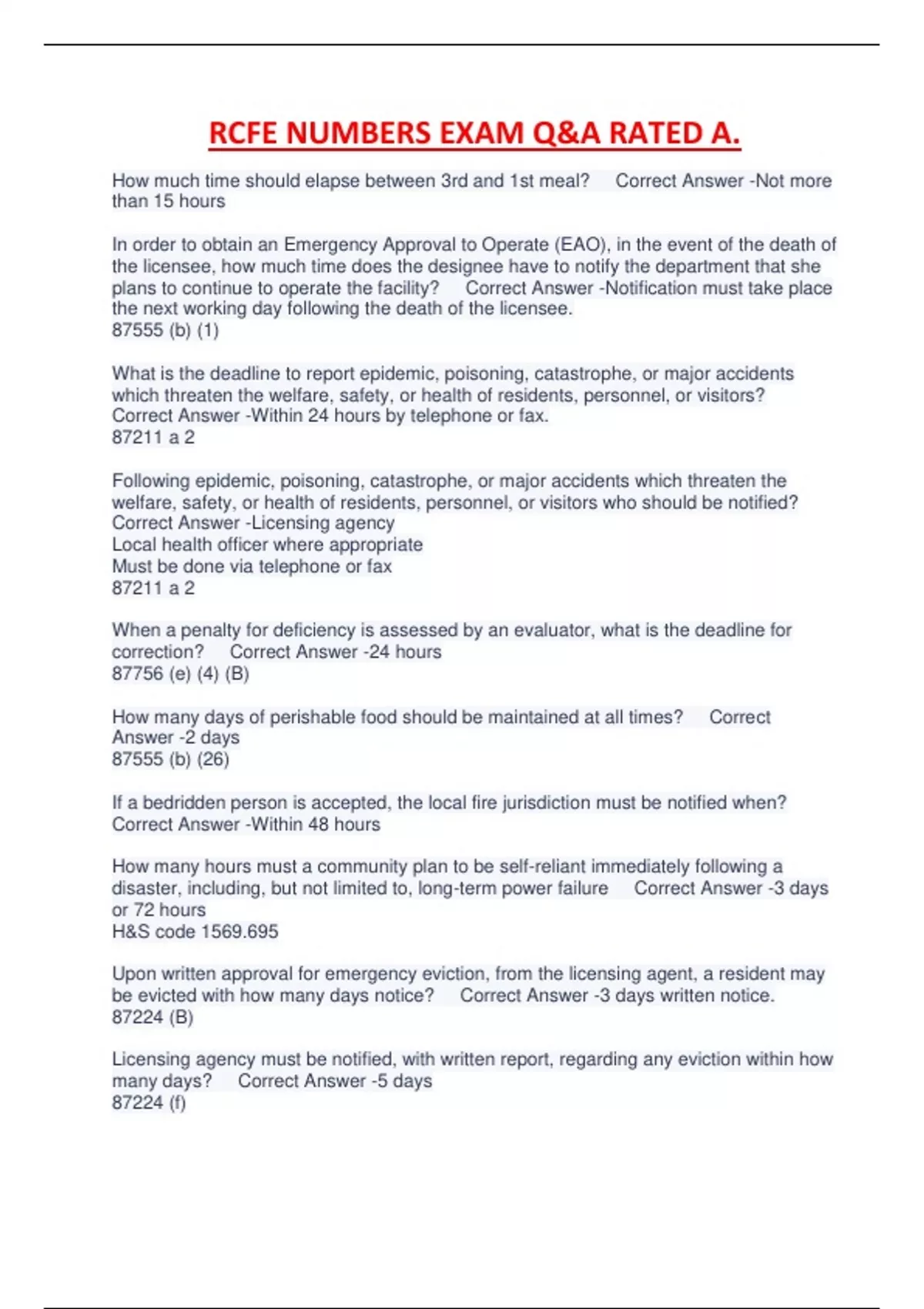 RCFE NUMBERS EXAM Q&A RATED A