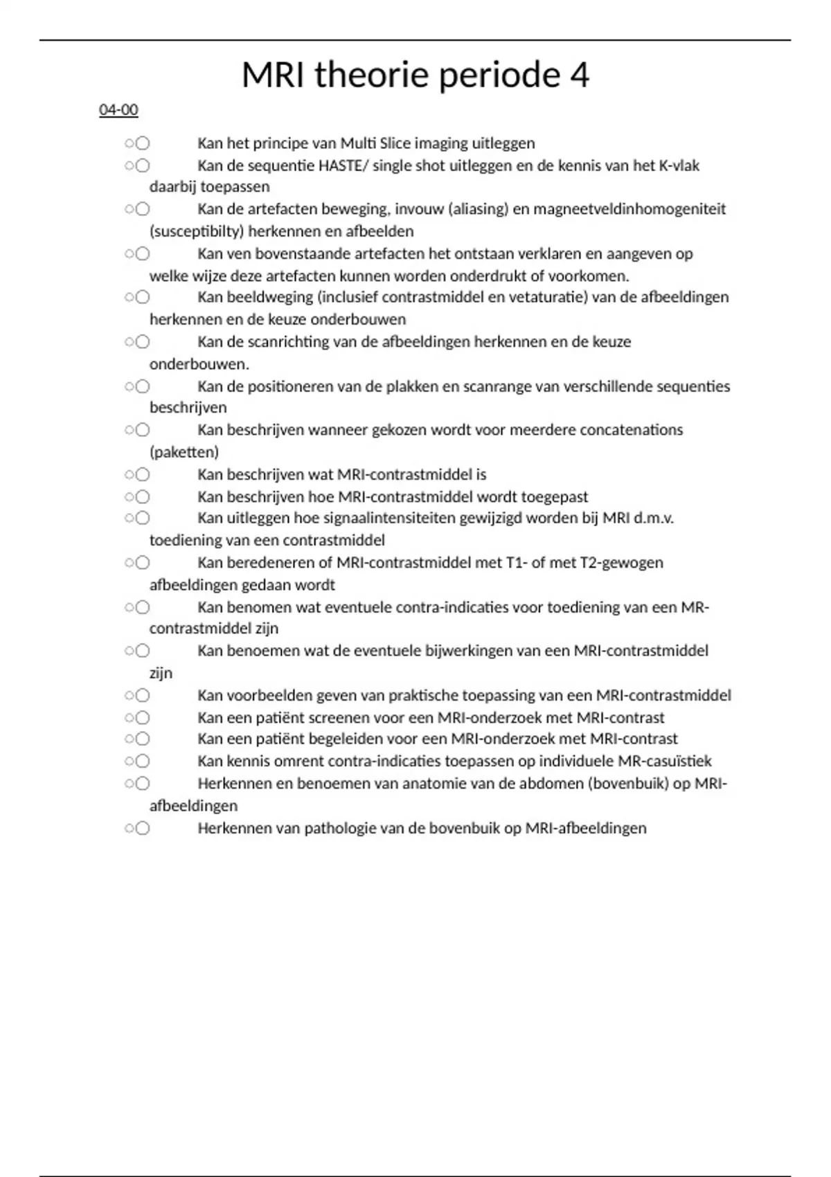 In dit document staat een samenvatting van de leerdoelen van MRI periode 4 jaar 1
