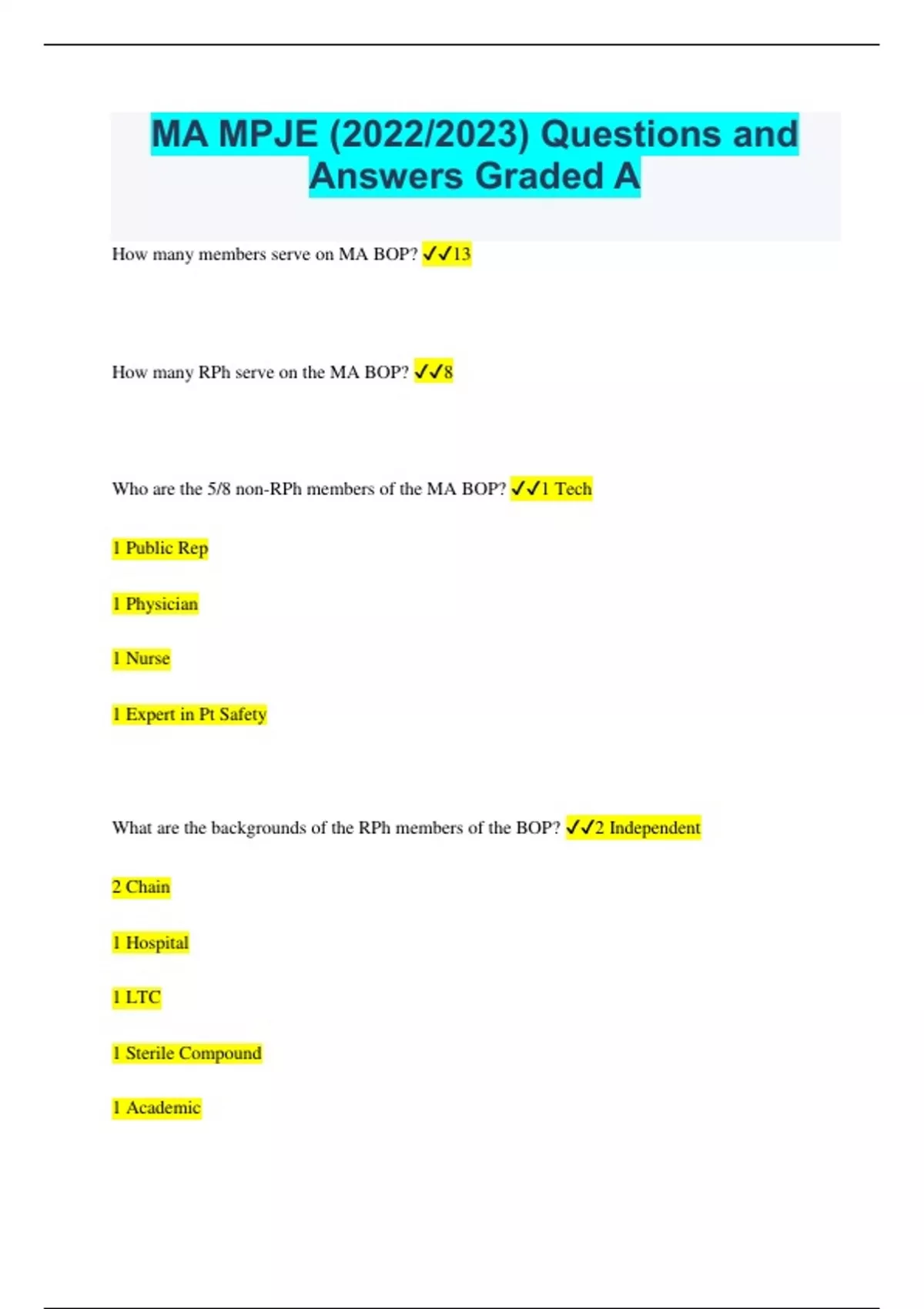 MA MPJE (2022/2023) Questions and Answers Graded A How many members serve on MA BOP? 13 How many RPh serve on the MA BOP? 8 Who are the 5/8 non-RPh members of the MA BOP? 1 Tech 1 Public Rep 1 Physician 1 Nurse 1 Expert in Pt Safety What are the backgrounds of the RPh members of the BOP? 2 Independent 2 Chain 1 Hospital 1 LTC 1 Sterile Compound 1 Academic