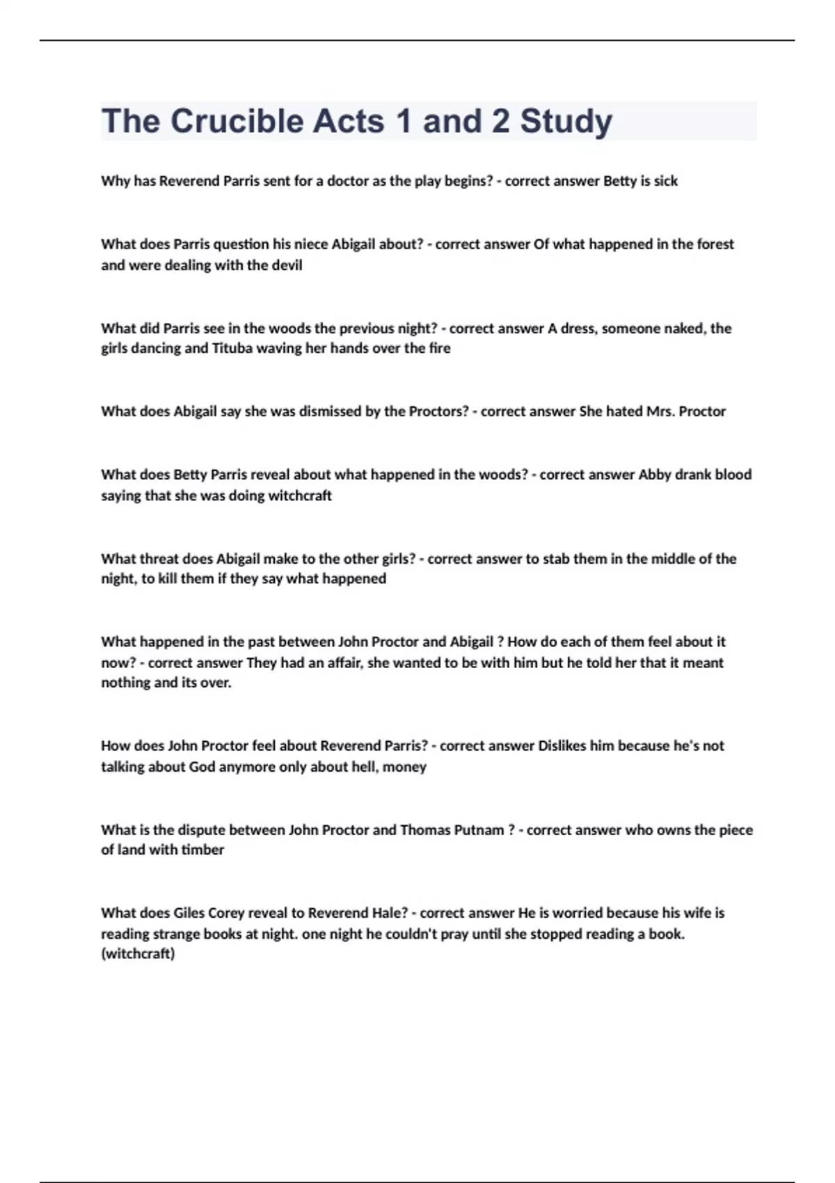 What does Parris question his niece Abigail about? - correct answer Of what happened in the forest and were dealing with the devil What did Parris see in the woods the previous night? - correct answer A dress, someone naked, the girls dancing and Tituba waving her hands over the fire What does Abigail say she was dismissed by the Proctors? - correct answer She hated Mrs. Proctor What does Betty Parris reveal about what happened in the woods? - correct answer Abby drank blood saying that she was doing witchcraft What threat does Abigail make to the other girls? - correct answer to stab them in the middle of the night, to kill them if they say what happened What happened in the past between John Proctor and Abigail ? How do each of them feel about it now? - correct answer They had an affair, she wanted to be with him but he told her that it meant nothing and its over. How does John Proctor feel about Reverend Parris? - correct answer Dislikes him because he's not talking about God anymore only about hell, money What is the dispute between John Proctor and Thomas Putnam ? - correct answer who owns the piece of land with timber What does Giles Corey reveal to Reverend Hale? - correct answer He is worried because his wife is reading strange books at night. one night he couldn't pray until she stopped reading a book. (witchcraft) When Abigail is questioned by Reverend Hale, who does she blame? What proof does she offer? - correct answer She blames that Tituba made her drink blood, comes to her in her dreams and makes her laugh during prayer What ultimatum is Tituba given ? - correct answer Confess to being a witch or be wiped until you die (wiped to death) Who does Tituba accuse of being a witch? - correct answer Sarah Good and Goody Osburn/Sarah Osburn Why does Abigail start accusing people at this point ? - correct answer When Tituba saves herself by "confessing". Which makes Abigail decide to do the same. Why does Betty Parris start accusing people? - correct answer she follows Abigail's and Tituba's example Define Dissembling - correct answer concealing one's true motives Define Propriety - correct answer acting correctly in a situation Define Deference - correct answer is couteous respect or regard Define Compromise - correct answer to endanger the reputation or interests of ; to expose to suspicion Define Pretense - correct answer a false show or appearance, especially for the purpose of deceiving ; falseness Define Contention - correct answer Verbal argument or struggle ; quarreling Define Prodigious - correct answer amazing Define Canny - correct answer sharp, clever, and careful in one's dealings with others Why has Mary Warren disobeyed her employers and gone to Salem? - correct answer She is an official of the court, accusing people of being witches. What did Abigail Williams reveal to John Proctor? Elizabeth reminds him of this. - correct answer to tell them that Abigail said that what they did had nothing to do with witchcraft. What lie did John Proctor tell to Elizabeth which makes her more suspicious of him? - correct answer he had been at Reverend Parris house and told his wife that he was with Abigail alone but he confessed to be with her for just a sec. What news does Mary Warren reveal to John and Elizabeth about the trials? - correct answer That 39 has been accused and Sarah Good will be hanged if not confess What does Mary Warren mean when she says, "I saved her life today!"? - correct answer Elizabeth was accused. Using her position in the court to boss people around What does Elizabeth realize when she finds out that she has been accused? - correct answer Abigail wants Elizabeth dead so she can marry John. What does Elizabeth ask John to do? - correct answer To go to Abigail and tell her that she was just a bad person for sleeping with him. That the relationship meant nothing and that she was just used Why does Reverend Hale visit the Proctors? - correct answer He is investigating the stories that he heard in the court (make his own opinion about the Proctors). What does Reverend Hale ask Proctor to do? - correct answer to recite the Ten Commandments Discuss the meaning of "Adultery, John." - correct answer Ironic his wife said this and that it was something that he did. He forgot this commandment. What information does John Proctor reveal to Reverend Hale? - correct answer Abigail admitted to John that there was no witchcraft going on What news does Giles Corey reveal to the Proctors and Reverend Hale? - correct answer Rebecca Nurse and Corey were taken into Jail What has Rebecca Nurse been accused of? - correct answer for the murder of Goody Putnam's babies, she is jealous of Rebecca nurse Why do Ezekial Cheever and Marshal Herrick arrive at the Proctor home? - correct answer they have a warrant to arrest Elizabeth Explain why Cheever is both astonished and afraid when he finds the poppet with the needle in it? - correct answer Abigail had fallen over screaming with a needle in her side. What does John ask Mary Warren to do? - correct answer He wants her to explain to the court that she made the poppet (not Elizabeth ) Why is Mary so afraid to do as he asks? - correct answer She says that Abigail will kill her Why does Mary Warren warn John about testifying against Abigail? - correct answer She will "charge lechery" (reveal the affaire) and ruin him