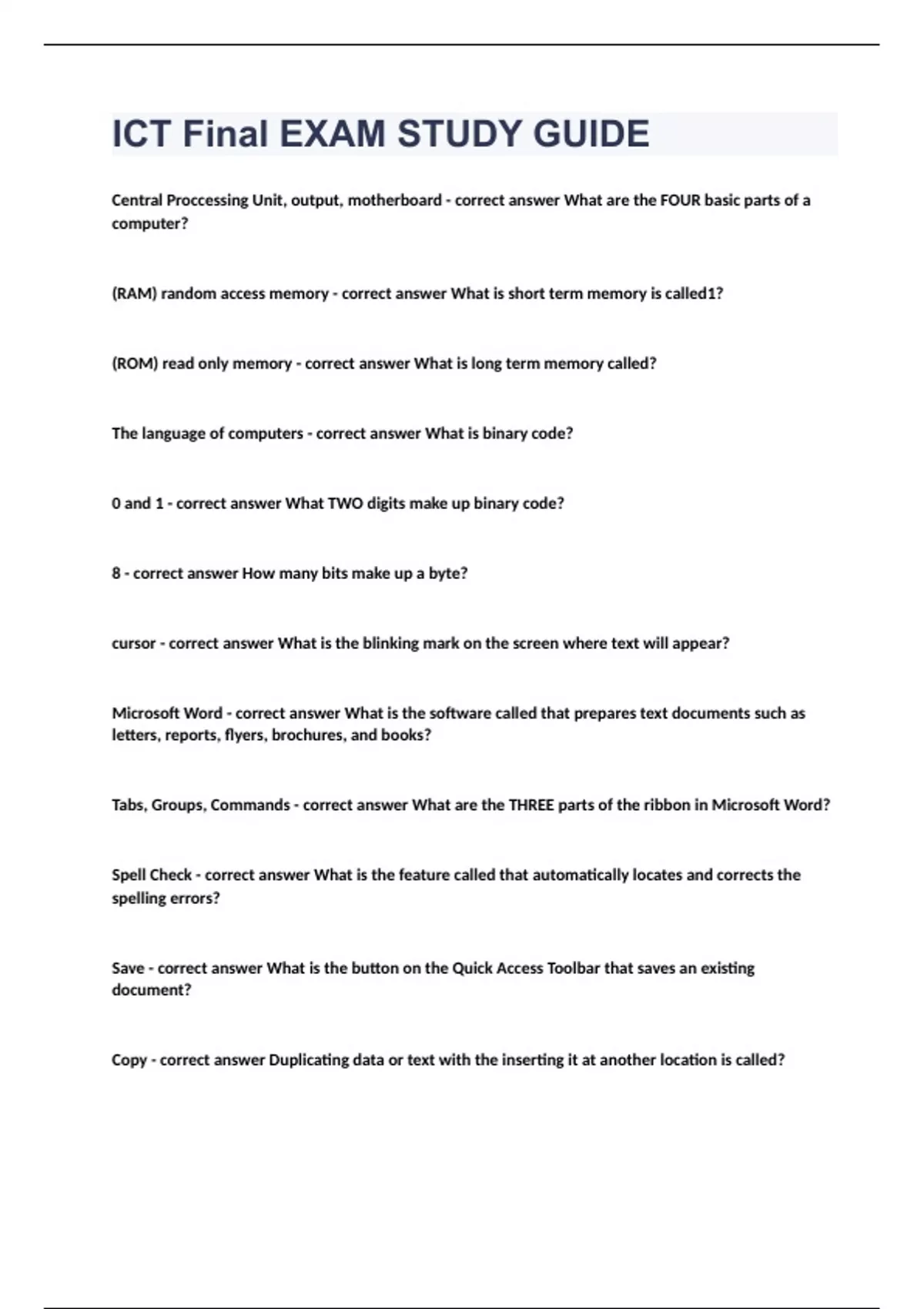 Save - correct answer What is the button on the Quick Access Toolbar that saves an existing document? Copy - correct answer Duplicating data or text with the inserting it at another location is called? Paste - correct answer Inserting previously cut or copied data or text back into the document is called? Quick Access Toolbar - correct answer A small, customizable toolbar at the top of the screen with buttons for common commands such as save and print is called? Bold - correct answer A font style that makes text appear in darker type is called? Theme - correct answer In Microsoft PowerPoint, what is a predefined combination of colors, fonts, and font effects that can be applied to your presentation? A preset starting file designed and formatted for a specific purpose. - correct answer What is a Template in Microsoft PowerPoint? 6x6 - correct answer What is the rule you should use for the amount of text that appears on each side? yes - correct answer Should you ask questions when presenting a powerpoint? Areil and Times New Roman - correct answer What are TWO types of font that are acceptable when typing a business letter? Return Adress - correct answer The first address that appears at the top of business letter is called? (YOUR INFORMATION) 2 inches - correct answer What should be at the top margin be when typing a business letter?