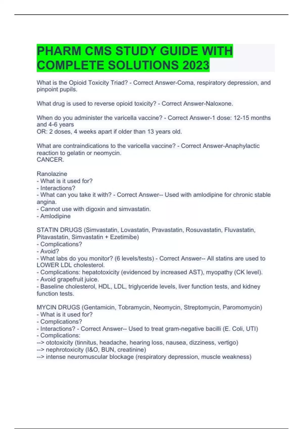 PHARM CMS STUDY GUIDE WITH COMPLETE SOLUTIONS 2023