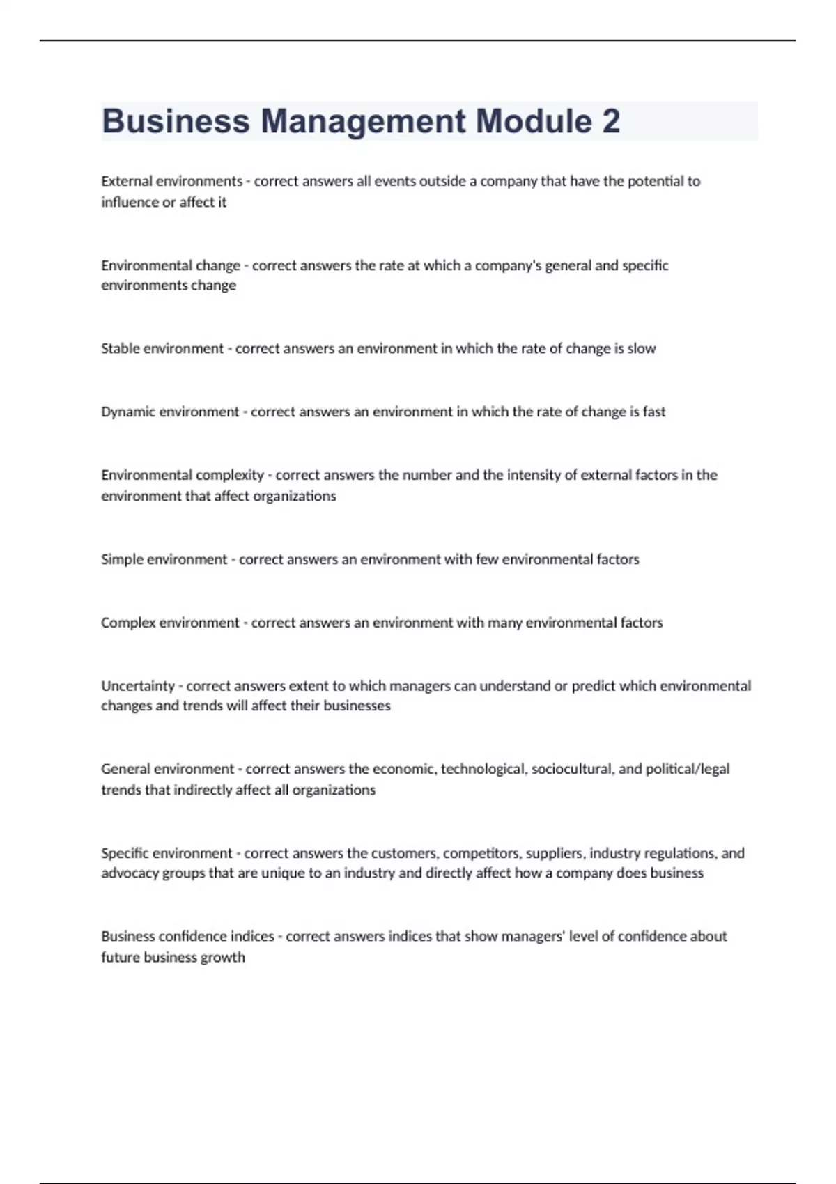 Dynamic environment - correct answers an environment in which the rate of change is fast Environmental complexity - correct answers the number and the intensity of external factors in the environment that affect organizations Simple environment - correct answers an environment with few environmental factors Complex environment - correct answers an environment with many environmental factors Uncertainty - correct answers extent to which managers can understand or predict which environmental changes and trends will affect their businesses General environment - correct answers the economic, technological, sociocultural, and political/legal trends that indirectly affect all organizations Specific environment - correct answers the customers, competitors, suppliers, industry regulations, and advocacy groups that are unique to an industry and directly affect how a company does business Business confidence indices - correct answers indices that show managers' level of confidence about future business growth Technology - correct answers the knowledge, tools, and techniques used to transform inputs into outputs Competitors - correct answers companies in the same industry that sell similar products or services to customers Competitive analysis - correct answers a process for monitoring the competition that involves identifying competition, anticipating their moves, and determining their strengths and weaknesses Buyer dependence - correct answers the degree to which a supplier relies on a buyer because of the importance of that buyer to the supplier and the difficulty of finding other buyers for its products Industry regulation - correct answers regulations and rules that govern the business practices and procedures of specific industries, businesses, and professions Advocacy groups - correct answers concerned citizens who band together to try to influence the business practices of specific industries, businesses, and professions Public communications - correct answers an advocacy group tactic that relies on voluntary participation by the news media and the advertising industry to get the advocacy group's message out Media advocacy - correct answers an advocacy group tactic that involves framing issues as public issues; exposing questionable, exploitative, or unethical practices; and forcing media coverage by buying media time or creating controversy that is likely to receive extensive news coverage Product boycott - correct answers an advocacy group tactic that involves protesting a company's actions by persuading consumers not to purchase its product or service Environmental scanning - correct answers searching the environment for important events or issues that might affect an organization Internal environment - correct answers the events and trends inside an organization that affect management, employees, and organizational culture Ethics - correct answers the set of moral principles or values that defines right and wrong for a person or group Ethical behavior - correct answers behavior that conforms to a society's accepted principles of right and wrong Workplace deviance - correct answers unethical behavior that violates organizational norms about right and wrong Production deviance - correct answers unethical behavior that hurts the quality and quantity of work produced Property deviance - correct answers unethical behavior aimed at the organization's property or products Employee shrinkage - correct answers employee theft of company merchandise Personal aggression - correct answers hostile or aggressive behavior toward others Ethical intensity - correct answers the degree of concern people have about an ethical issue Social consensus - correct answers agreement on whether behavior is bad or good Probability of effect - correct answers the chance that something will happen that results in harm to others Temporal immediacy - correct answers the time between an act and the consequences the act produces Proximity of effect - correct answers the social, psychological, cultural, or physical distance between a decision maker and those affected by his or her decisions Postconventional level of moral development - correct answers the third level of moral development, in which people make decisions based on internalized principles Principle of long-term self-interest - correct answers an ethical principle that holds that you should never take any action that is not in your or your organization's long-term self-interest Principle of religious injunctions - correct answers an ethical principle that holds that you should never take any action that is not kind and that does not build a sense of community Principle of government requirements - correct answers an ethical principle that holds that you should never take any action that violates the law, for the law represents the minimal moral standard Principle of individual rights - correct answers an ethical principle that holds that you should never take any action that infringes on others' agreed-upon rights Overt integrity test - correct answers a written test that estimates job applicants' honesty by directly asking them what they think or feel about theft or about punishment of unethical behaviors Personality-based integrity test - correct answers a written test that indirectly estimates job applicants' honesty by measuring psychological traits, such as dependability and conscientiousness Whistleblowing - correct answers reporting others' ethics violations to management or legal authorities Social responsibility - correct answers a business's obligation to pursue policies, make decisions, and take actions that benefit society Shareholder model - correct answers a view of social responsibility that holds that an organization's overriding goal should be profit maximization for the benefit of shareholders Stakeholder model - correct answers a theory of corporate responsibility that holds that management's most important responsibility, long-term survival,