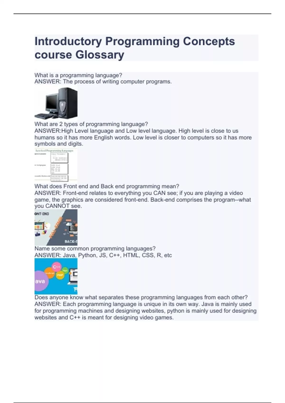 What is a programming language? ANSWER: The process of writing computer programs. What are 2 types of programming language? ANSWER:High Level language and Low level language. High level is close to us humans so it has more English words. Low level is closer to computers so it has more symbols and digits. What does Front end and Back end programming mean? ANSWER: Front-end relates to everything you CAN see; if you are playing a video game, the graphics are considered front-end. Back-end comprises the program--what you CANNOT see. Name some common programming languages? ANSWER: Java, Python, JS, C++, HTML, CSS, R, etc Does anyone know what separates these programming languages from each other? ANSWER: Each programming language is unique in its own way. Java is mainly used for programming machines and designing websites, python is mainly used for designing websites and C++ is meant for designing video games. Does anyone know what a computer program does when write it? ANSWER: It takes some sort of input, does something to it, and creates some output. You write it with a programming language. What is printing in proramming? ANSWER: Printing simply means to show or output something from computer.
