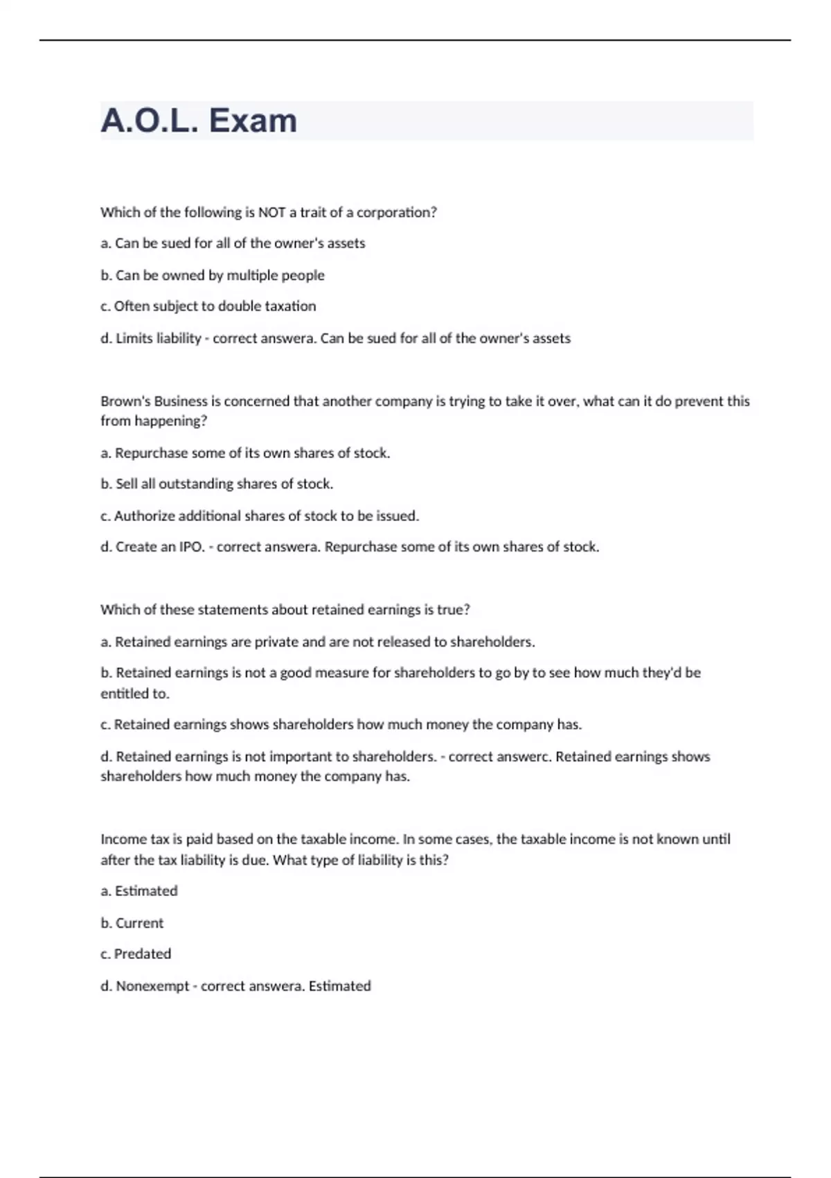 Which of the following is NOT a trait of a corporation? a. Can be sued for all of the owner's assets b. Can be owned by multiple people c. Often subject to double taxation d. Limits liability - correct answera. Can be sued for all of the owner's assets Brown's Business is concerned that another company is trying to take it over, what can it do prevent this from happening? a. Repurchase some of its own shares of stock. b. Sell all outstanding shares of stock. c. Authorize additional shares of stock to be issued. d. Create an IPO. - correct answera. Repurchase some of its own shares of stock.