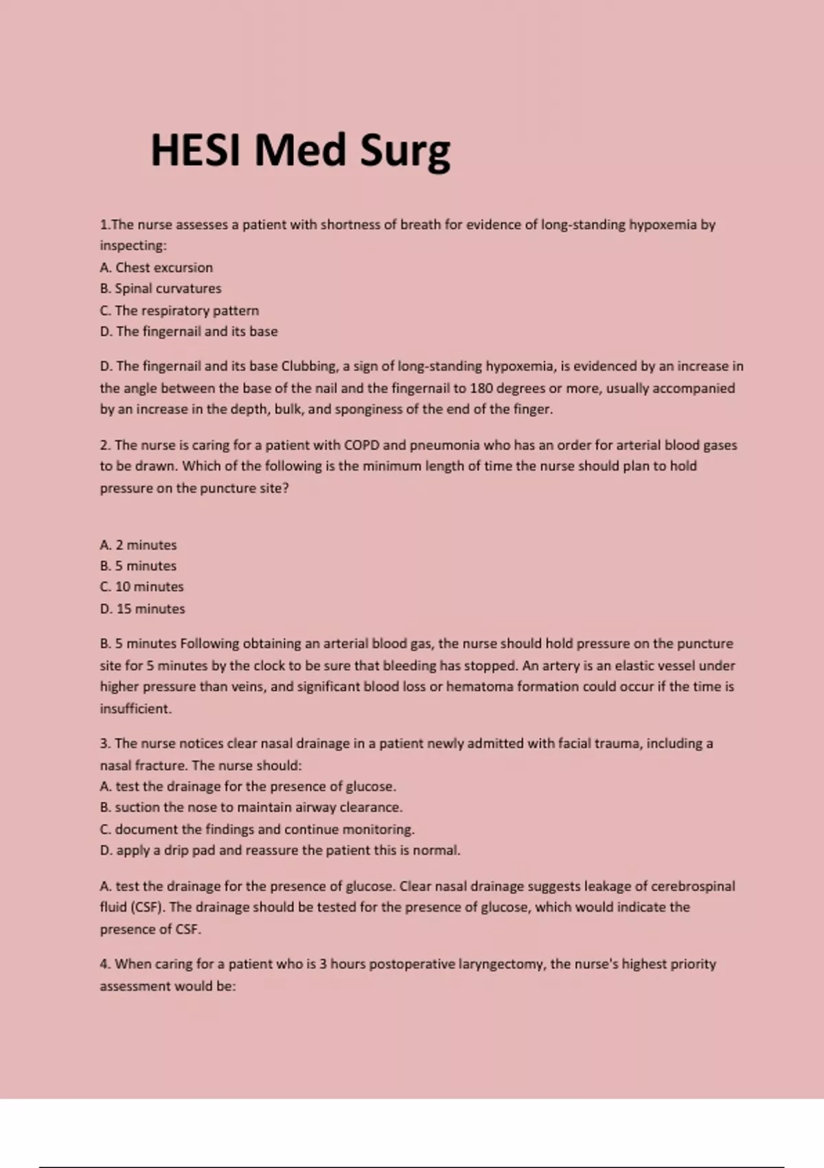 HESI Med Surg 1.The nurse assesses a patient with shortness of breath for evidence of long-standing hypoxemia by inspecting: A. Chest excursion B. Spinal curvatures C. The respiratory pattern D. The fingernail and its base D. The fingernail and its base Clubbing, a sign of long-standing hypoxemia, is evidenced by an increase in the angle between the base of the nail and the fingernail to 180 degrees or more, usually accompanied by an increase in the depth, bulk, and sponginess of the end of the finger. 2. The nurse is caring for a patient with COPD and pneumonia who has an order for arterial blood gases to be drawn. Which of the following is the minimum length of time the nurse should plan to hold pressure on the puncture site? A. 2 minutes B. 5 minutes C. 10 minutes D. 15 minutes B. 5 minutes Following obtaining an arterial blood gas, the nurse should hold pressure on the puncture site for 5 minutes by the clock to be sure that bleeding has stopped. An artery is an elastic vessel under higher pressure than veins, and significant blood loss or hematoma formation could occur if the time is insufficient. 3. The nurse notices clear nasal drainage in a patient newly admitted with facial trauma, including a nasal fracture. The nurse should: A. test the drainage for the presence of glucose. B. suction the nose to maintain airway clearance. C. document the findings and continue monitoring. D. apply a drip pad and reassure the patient this is normal. A. test the drainage for the presence of glucose. Clear nasal drainage suggests leakage of cerebrospinal fluid (CSF). The drainage should be tested for the presence of glucose, which would indicate the presence of CSF. 4. When caring for a patient who is 3 hours postoperative laryngectomy, the nurse's highest priority assessment would be: A. Airway patency B. Patient comfort C. Incisional drainage D. Blood pressure and heart rate A. Airway patency Remember ABCs with prioritization. Airway patency is always the highest priority and is essential for a patient undergoing surgery surrounding the upper respiratory system. 5. When initially teaching a patient the supraglottic swallow following a radical neck dissection, with which of the following foods should the nurse begin? A. Cola B. Applesauce C. French fries D. White grape juice A. ColaWhen learning the supraglottic swallow, it may be helpful to start with carbonated beverages because the effervescence provides clues about the liquid's position. Thin, watery fluids should be avoided because they are difficult to swallow and increase the risk of aspiration. Nonpourable pureed foods, such as applesauce, would decrease the risk of aspiration, but carbonated beverages are the better choice to start with