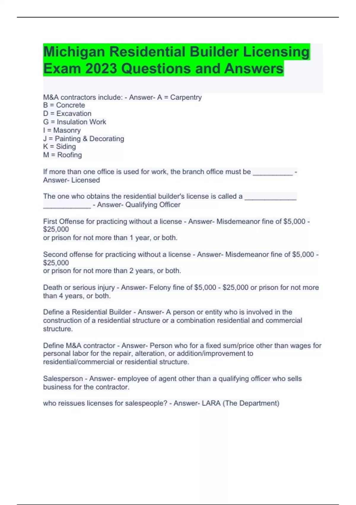 Michigan Residential Builder Licensing Exam 2023 Questions and Answers
