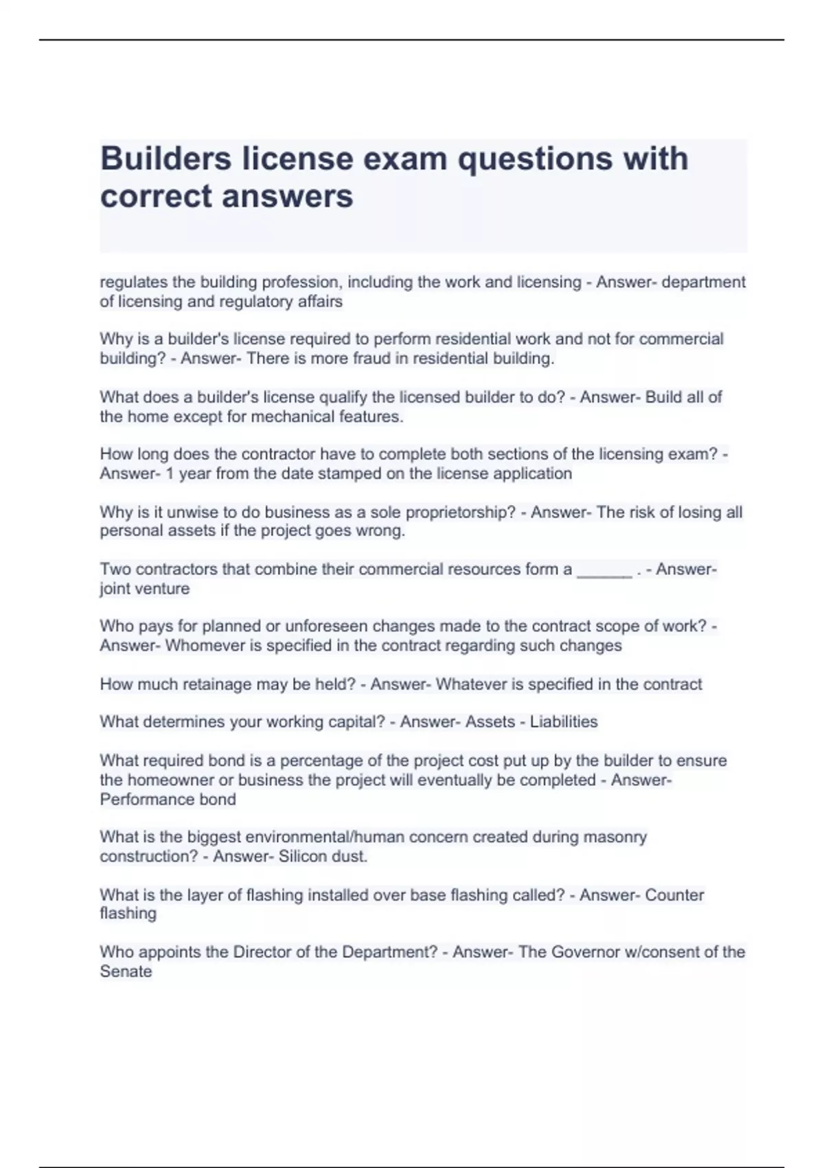 Builders license exam questions with correct answers