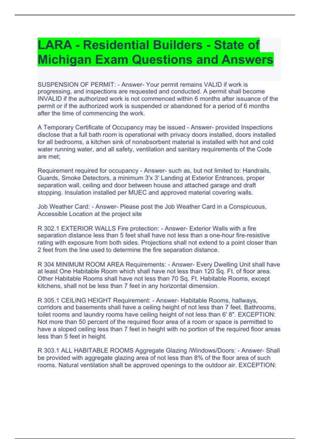 LARA - Residential Builders - State of Michigan Exam Questions and Answers