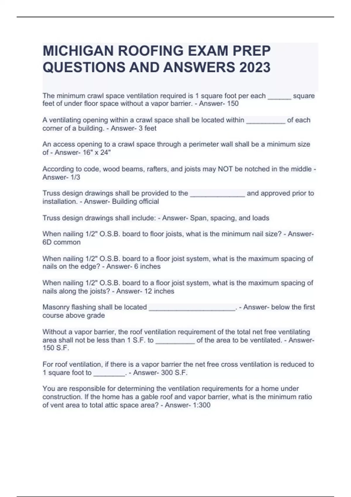 MICHIGAN ROOFING EXAM PREP QUESTIONS AND ANSWERS 2023