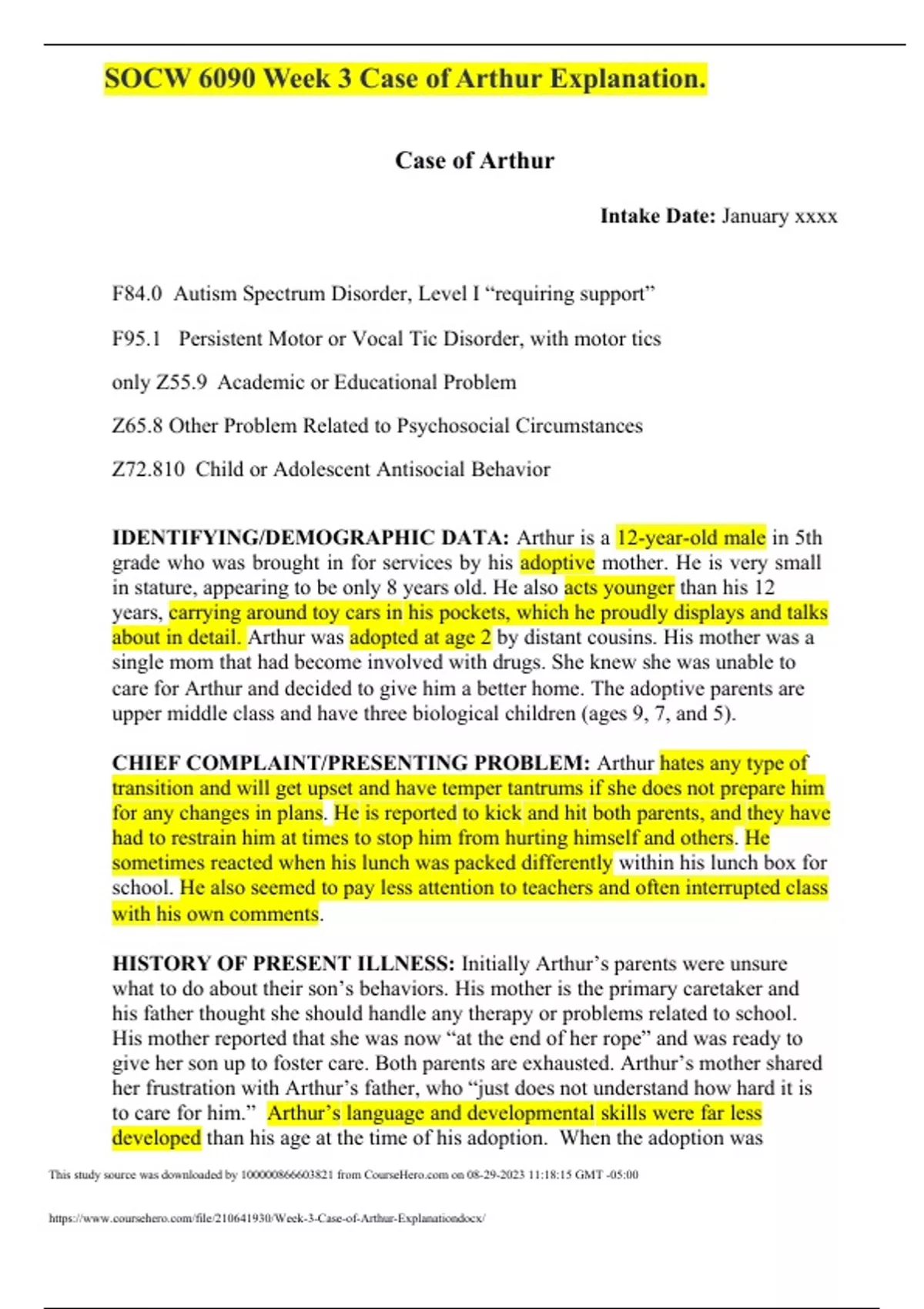 SOCW 6090 Week 3 Case of Arthur Explanation. Case of Arthur Intake Date: January xxxx F84.0 Autism Spectrum Disorder, Level I “requiring support” F95.1 Persistent Motor or Vocal Tic Disorder, with motor tics only Z55.9 Academic or Educational Problem Z65.8 Other Problem Related to Psychosocial Circumstances Z72.810 Child or Adolescent Antisocial Behavior IDENTIFYING/DEMOGRAPHIC DATA: Arthur is a 12-year-old male in 5th grade who was brought in for services by his adoptive mother. He is very small in stature, appearing to be only 8 years old. He also acts younger than his 12 years, carrying around toy cars in his pockets, which he proudly displays and talks about in detail. Arthur was adopted at age 2 by distant cousins. His mother was a single mom that had become involved with drugs. She knew she was unable to care for Arthur and decided to give him a better home. The adoptive parents are upper middle class and have three biological children (ages 9, 7, and 5). CHIEF COMPLAINT/PRESENTING PROBLEM: Arthur hates any type of transition and will get upset and have temper tantrums if she does not prepare him for any changes in plans. He is reported to kick and hit both parents, and they have had to restrain him at times to stop him from hurting himself and others. He sometimes reacted when his lunch was packed differently within his lunch box for school. He also seemed to pay less attention to teachers and often interrupted class with his own comments. HISTORY OF PRESENT ILLNESS: Initially Arthur’s parents were unsure what to do about their son’s behaviors. His mother is the primary caretaker and his father thought she should handle any therapy or problems related to school. His mother reported that she was now “at the end of her rope” and was ready to give her son up to foster care. Both parents are exhausted. Arthur’s mother shared her frustration with Arthur’s father, who “just does not understand how hard it is to care for him.” Arthur’s language and developmental skills were far less developed than his age at the time of his adoption. When the adoption was completed and they brought him home, Arthur cried often and refused to sleep for the first 2 days they had him. They tried holding him, but he would not quiet down.