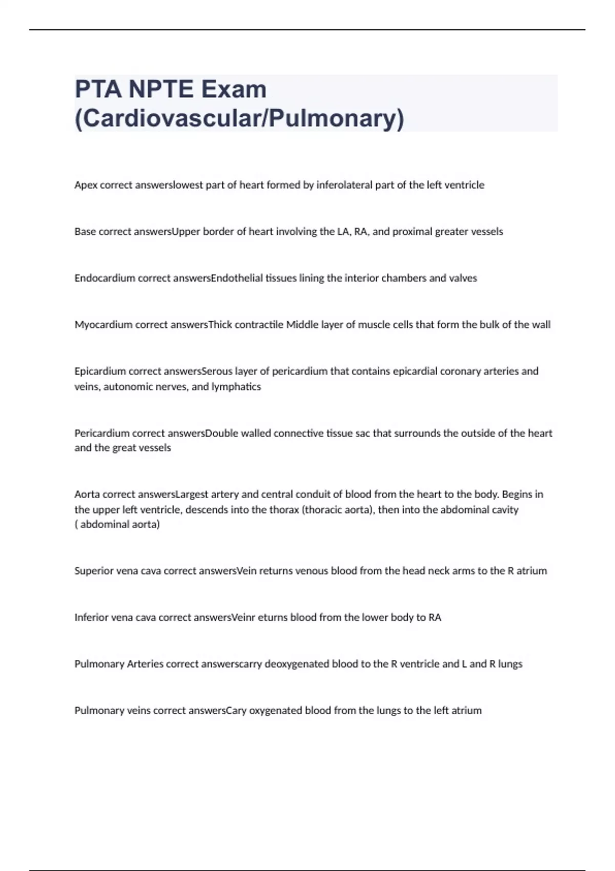 Apex correct answerslowest part of heart formed by inferolateral part of the left ventricle Base correct answersUpper border of heart involving the LA, RA, and proximal greater vessels Endocardium correct answersEndothelial tissues lining the interior chambers and valves Myocardium correct answersThick contractile Middle layer of muscle cells that form the bulk of the wall Epicardium correct answersSerous layer of pericardium that contains epicardial coronary arteries and veins, autonomic nerves, and lymphatics Pericardium correct answersDouble walled connective tissue sac that surrounds the outside of the heart and the great vessels Aorta correct answersLargest artery and central conduit of blood from the heart to the body. Begins in the upper left ventricle, descends into the thorax (thoracic aorta), then into the abdominal cavity ( abdominal aorta) Superior vena cava correct answersVein returns venous blood from the head neck arms to the R atrium Inferior vena cava correct answersVeinr eturns blood from the lower body to RA Pulmonary Arteries correct answerscarry deoxygenated blood to the R ventricle and L and R lungs Pulmonary veins correct answersCary oxygenated blood from the lungs to the left atrium