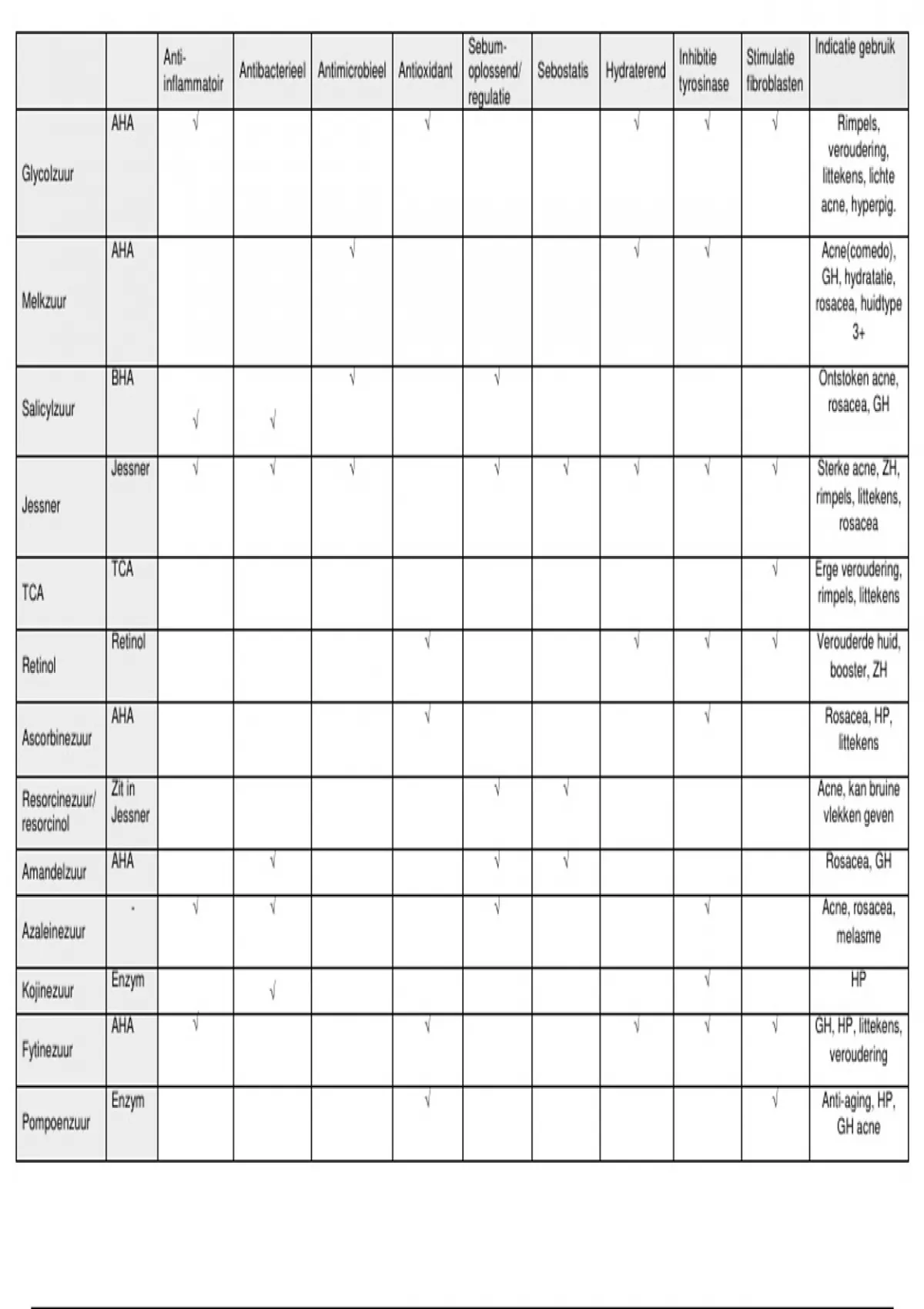 Samenvatting Tabel met chemische peelings, overzichtelijk