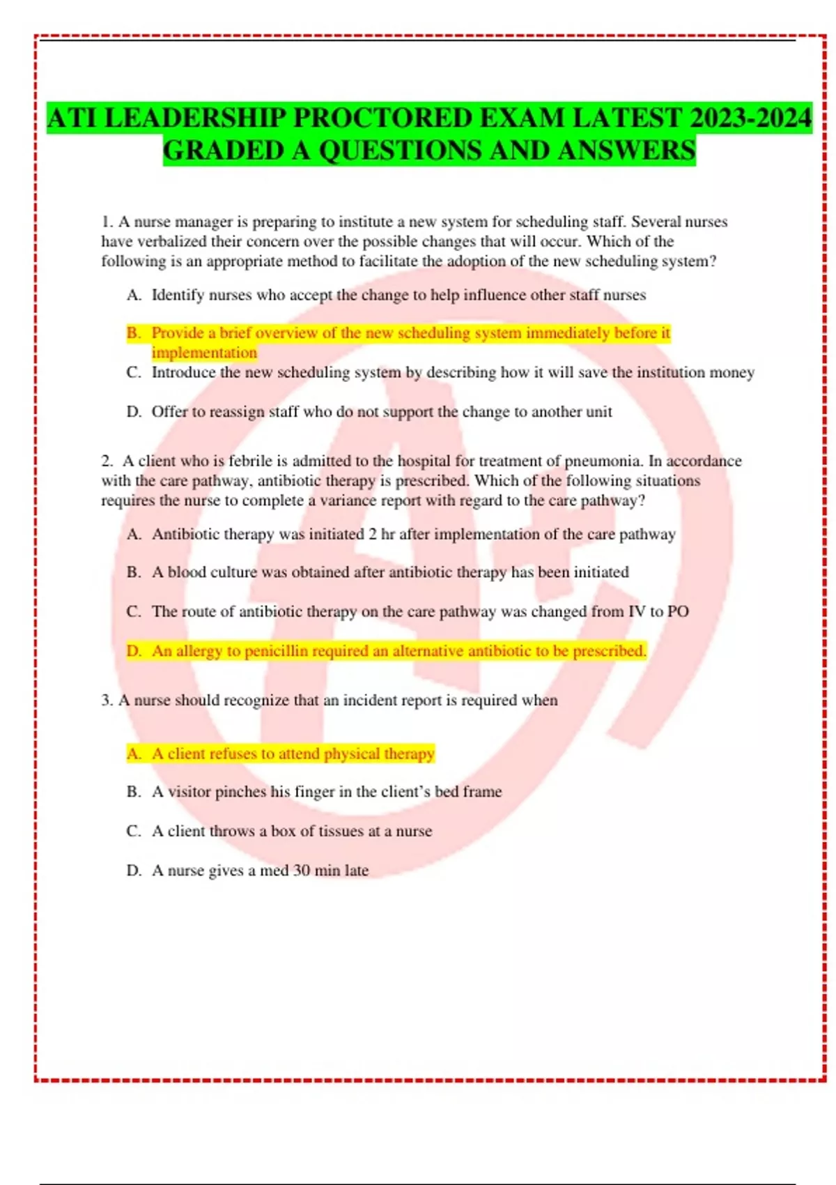 ATI LEADERSHIP PROCTORED EXAM LATEST GRADED A QUESTIONS AND ANSWERS