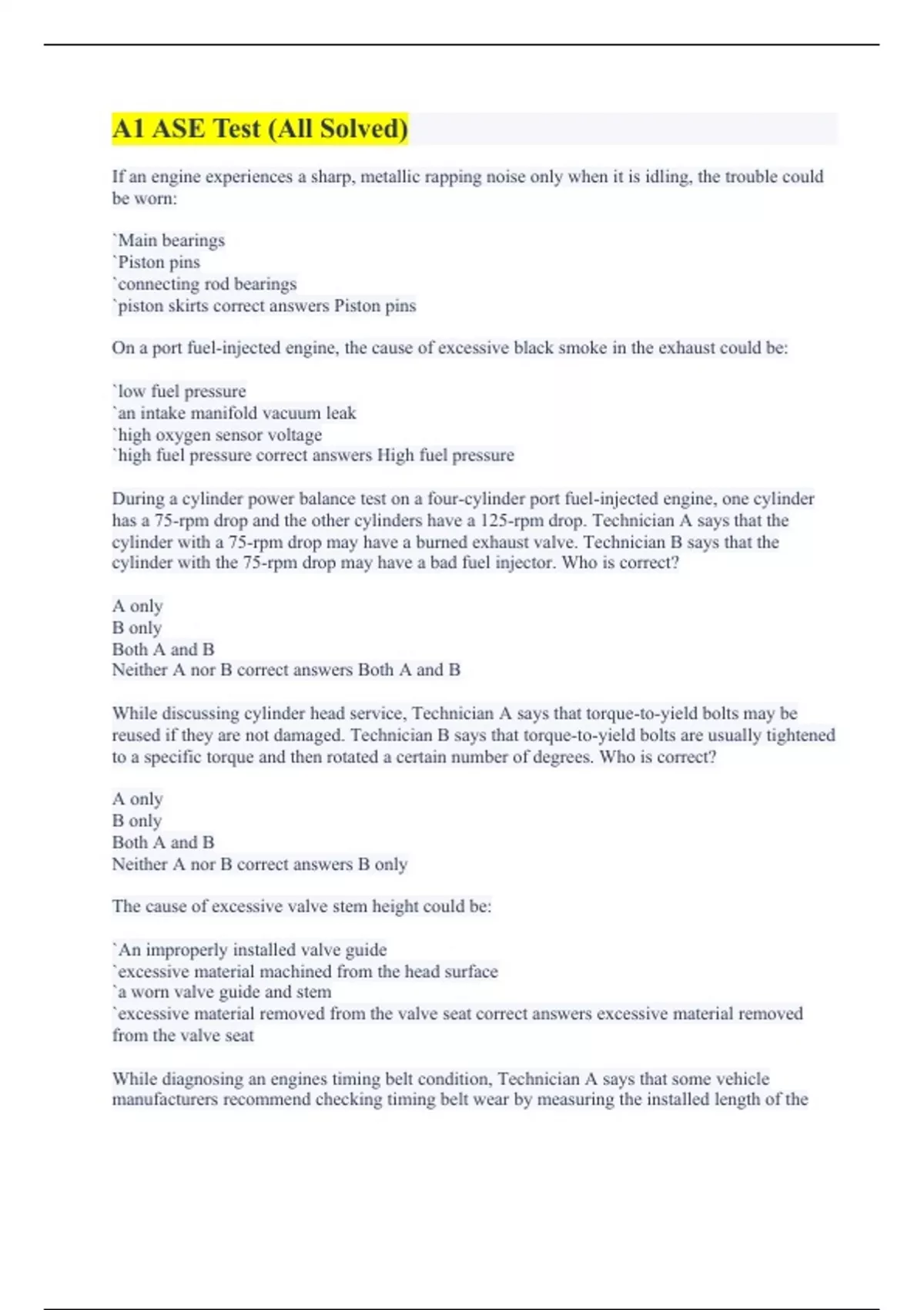 If an engine experiences a sharp, metallic rapping noise only when it is idling, the trouble could be worn: `Main bearings `Piston pins `connecting rod bearings `piston skirts correct answers Piston pins On a port fuel-injected engine, the cause of excessive black smoke in the exhaust could be: `low fuel pressure `an intake manifold vacuum leak `high oxygen sensor voltage `high fuel pressure correct answers High fuel pressure During a cylinder power balance test on a four-cylinder port fuel-injected engine, one cylinder has a 75-rpm drop and the other cylinders have a 125-rpm drop. Technician A says that the cylinder with a 75-rpm drop may have a burned exhaust valve. Technician B says that the cylinder with the 75-rpm drop may have a bad fuel injector. Who is correct? A only B only Both A and B Neither A nor B correct answers Both A and B While discussing cylinder head service, Technician A says that torque-to-yield bolts may be reused if they are not damaged. Technician B says that torque-to-yield bolts are usually tightened to a specific torque and then rotated a certain number of degrees. Who is correct? A only B only Both A and B Neither A nor B correct answers B only The cause of excessive valve stem height could be: `An improperly installed valve guide `excessive material machined from the head surface `a worn valve guide and stem `excessive material removed from the valve seat correct answers excessive material removed from the valve seat While diagnosing an engines timing belt condition, Technician A says that some vehicle manufacturers recommend checking timing belt wear by measuring the installed length of the