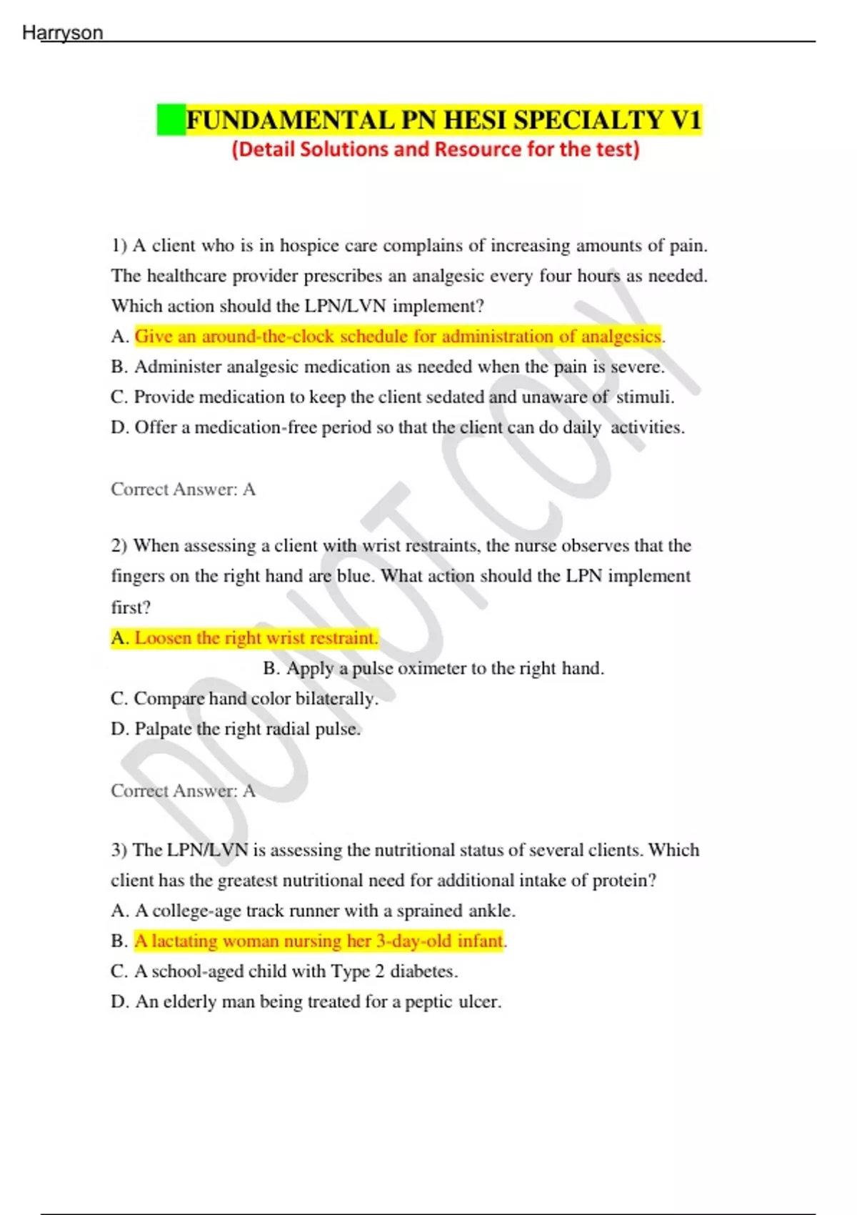 Fundamental pn hesi specialty v1NDAMENTAL PN HESI SPECIALTY V1 (Detail Solutions and Resource for the test) 1) A client who is in hospice care complains of increasing amounts of pain. The healthcare provider prescribes an analgesic every four hours as needed. Which action should the LPN/LVN implement? A. Give an around-the-clock schedule for administration of analgesics. B. Administer analgesic medication as needed when the pain is severe. C. Provide medication to keep the client sedated and unaware of stimuli. D. Offer a medication-free period so that the client can do daily activities. Correct Answer: A 2) When assessing a client with wrist restraints, the nurse observes that the fingers on the right hand are blue. What action should the LPN implement first? A. Loosen the right wrist restraint. B. Apply a pulse oximeter to the right hand. C. Compare hand color bilaterally. D. Palpate the right radial pulse. Correct Answer: A 3) The LPN/LVN is assessing the nutritional status of several clients. Which client has the greatest nutritional need for additional intake of protein? A. A college-age track runner with a sprained ankle. B. A lactating woman nursing her 3-day-old infant. C. A school-aged child with Type 2 diabetes. D. An elderly man being treated for a peptic ulcer