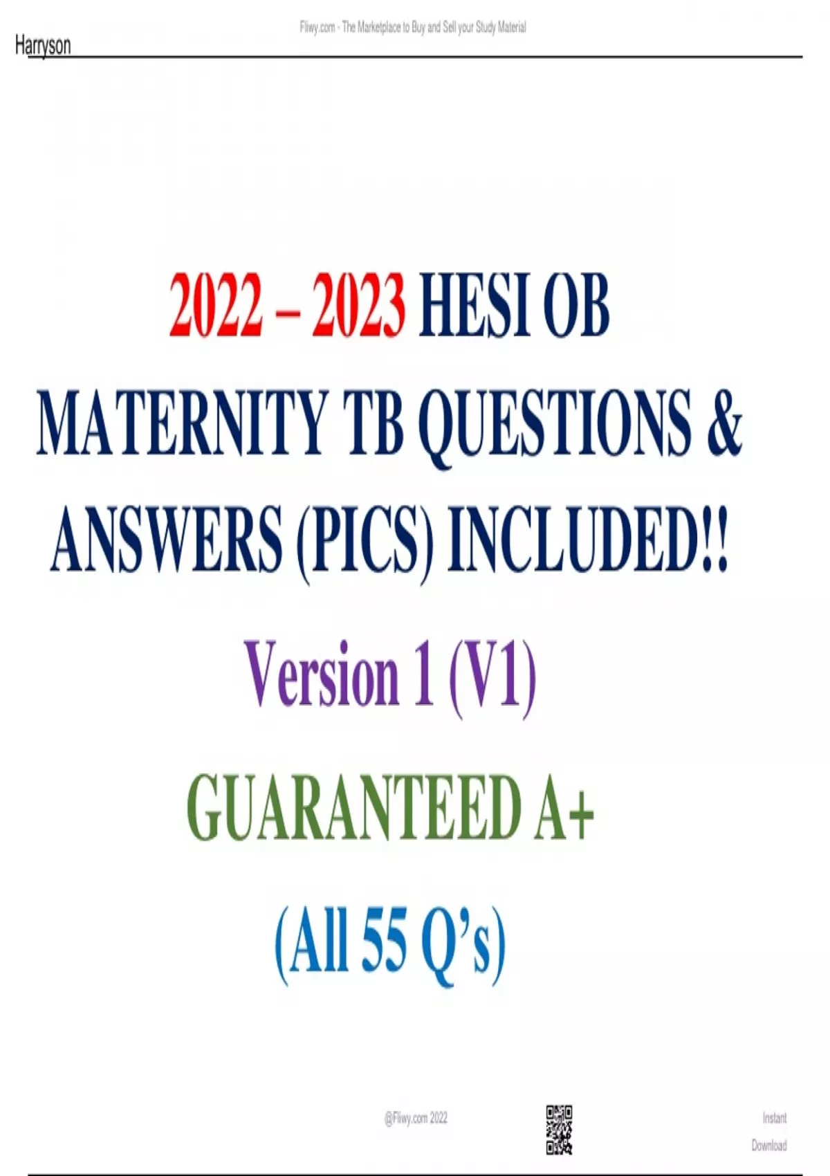 HESI MATERNITY TEST BANK 2022 – 2023 HESI OB MATERNITY TB QUESTIONS & ANSWERS (PICS) INCLUDED!! Version 1 (V1) GUARANTEED A+ (All 55 Q’s) F - The Marketplace to Buy and Sell your Study Material @F 2022 Instant Download Harryson 4 = D F - The Marketplace to Buy and Sell your Study Material @F 2022 Instant Download Harryson 5= 10 6=D F - The Marketplace to Buy and Sell your Study Material @F 2022 Instant Download Harryson 7 = A 8 = D F - The Marketplace to Buy and Sell your Study Material @F 2022 Instant Download Harry