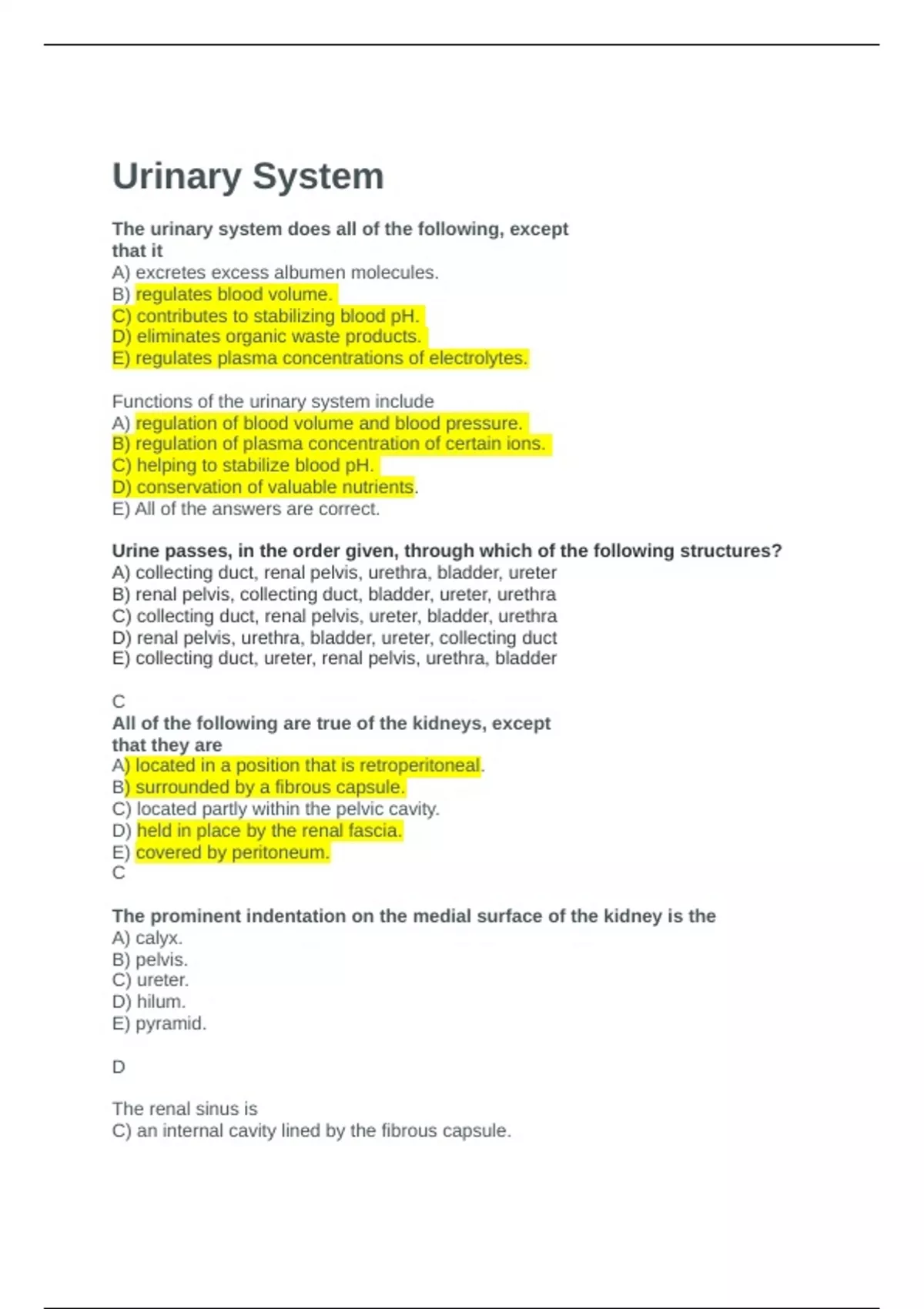 BIOS 256 FINAL EXAM STUDY Q&A | Comprehensive ATI BIOS 256 FINAL EXAM STUDY Q&A | Comprehensive ATI 1) The urinary system does all of the following, EXCEPT it A secretes excess glucose molecules B regulates blood volume C contributes to stabilizing blood pH D eliminates organic waste products E regulates plasma concentrations of electrolytes 2) Conical structures that are located in the renal medulla are called A pyramids B renal columns C renal pelvises D nephrons E calyces 3) The region known as the macula densa is part of A the proximal convoluted tubule B the distal convoluted tubule C the collecting duct D the ascending loop of Henle E Bowman’s capsule 4) The cells of the macula densa and the juxtaglomerular cells form the A renal corpuscle B filtration membrane C loop of Henle D juxtaglomerular apparatus E afferent arteriole