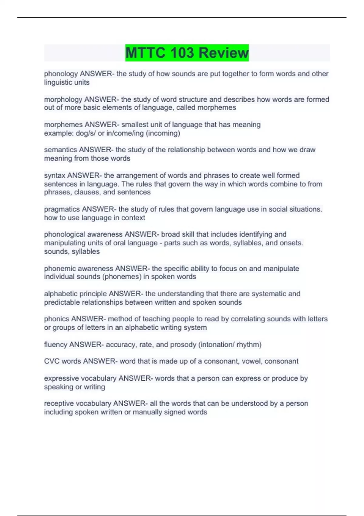 MTTC 103 Review phonology ANSWER- the study of how sounds are put together to form words and other linguistic units morphology ANSWER- the study of word structure and describes how words are formed out of more basic elements of language, called morphemes morphemes ANSWER- smallest unit of language that has meaning example: dog/s/ or in/come/ing (incoming) semantics ANSWER- the study of the relationship between words and how we draw meaning from those words syntax ANSWER- the arrangement of words and phrases to create well formed sentences in language. The rules that govern the way in which words combine to from phrases, clauses, and sentences pragmatics ANSWER- the study of rules that govern language use in social situations. how to use language in context phonological awareness ANSWER- broad skill that includes identifying and manipulating units of oral language - parts such as words, syllables, and onsets. sounds, syllables phonemic awareness ANSWER- the specific ability to focus on and manipulate individual sounds (phonemes) in spoken words alphabetic principle ANSWER- the understanding that there are systematic and predictable relationships between written and spoken sounds phonics ANSWER- method of teaching people to read by correlating sounds with letters or groups of letters in an alphabetic writing system fluency ANSWER- accuracy, rate, and prosody (intonation/ rhythm) CVC words ANSWER- word that is made up of a consonant, vowel, consonant expressive vocabulary ANSWER- words that a person can express or produce by speaking or writing receptive vocabulary ANSWER- all the words that can be understood by a person including spoken written or manually signed words