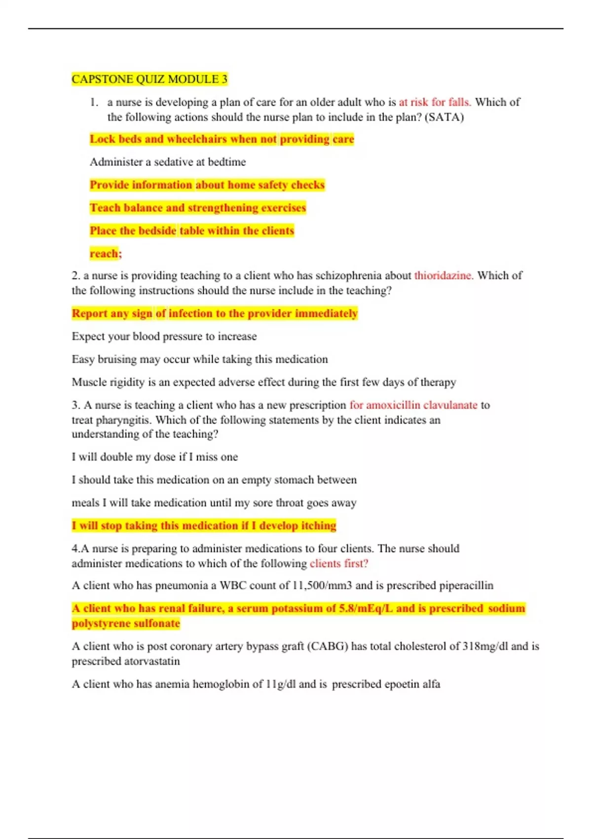 CAPSTONE QUIZ MODULE 3 1. a nurse is developing a plan of care for an older adult who is at risk for falls. Which of the following actions should the nurse plan to include in the plan? (SATA) Lock beds and wheelchairs when not providing care Administer a sedative at bedtime Provide information about home safety checks Teach balance and strengthening exercises Place the bedside table within the clients reach; 2. a nurse is providing teaching to a client who has schizophrenia about thioridazine. Which of the following instructions should the nurse include in the teaching? Report any sign of infection to the provider immediately Expect your blood pressure to increase Easy bruising may occur while taking this medication Muscle rigidity is an expected adverse effect during the first few days of therapy 3. A nurse is teaching a client who has a new prescription for amoxicillin clavulanate to treat pharyngitis. Which of the following statements by the client indicates an understanding of the teaching? I will double my dose if I miss one I should take this medication on an empty stomach between meals I will take medication until my sore throat goes away I will stop taking this medication if I develop itching 4. A nurse is preparing to administer medications to four clients. The nurse should administer medications to which of the following clients first? A client who has pneumonia a WBC count of 11,500/mm3 and is prescribed piperacillin A client who has renal failure, a serum potassium of 5.8/mEq/L and is prescribed sodium polystyrene sulfonate A client who is post coronary artery bypass graft (CABG) has total cholesterol of 318mg/dl and is prescribed atorvastatin A client who has anemia hemoglobin of 11g/dl and is prescribed epoetin alfa 5. a nurse caring for a client who is vomiting. Which of the following actions should the nurse take first? Administer an antiemetic to the client Notify housekeeping Prevent the client from aspirating Providing the client with an emesis basin 6. A nurse is providing teaching to a parent of a child who has celiac disease. The nurse should include which of the following food choices for this child? Rice Barley Wheat Rye 7. A nurse is caring for a client who is postoperative and has a prescription stockings. which of the following actions should the nurse take? Check the stockings for winkles Apply the stockings while the client is siting in a chair Measure the size of the clients foot Remove the stockings once each day 8. A nurse is teaching a client about which foods she should include in her low fiber diet. Which of the following statements indicates the client understands the teaching? A fresh pear would be a good snack option I can prepare refried beans for supper I should choose white rice as a side dish Bran cereal would be a good breakfast choice 10. A client is prescribed 1g potassium phosphate IV to be infused continuously over 6 hr. Available is 1 g potassium phosphate in 250ml dextrose 5% water (D5W). The nurse should set the IV pump to run at how many ml/hr?(round nearest whole number) 42. 11. a nurse is assessing a client who has a hip fracture. Which of the following findings should the nurse expect? Hip pallor Leg abduction Muscle spasms Leg lengthening 12. A nurse is reviewing the medical record of a client who has a new prescription for clozapine for the treatment of schizophrenia. Which of the following findings indicates a contraindication to clozapine? Fasting blood glucose 120mg/dl Asthma Hypertension WBC count 3.300/mm 13. A nurse is teaching a client who reports insomnia about promoting rest and sleep. Which of the following statements should the nurse identify as an indication that the client understands the instructions? I will walk briskly for 30minute before bedtime I will have a cup of hot cocoa immediately before bedtime I will no longer have a glass of wine before bedtime I will do my muscle relaxation techniques each afternoon