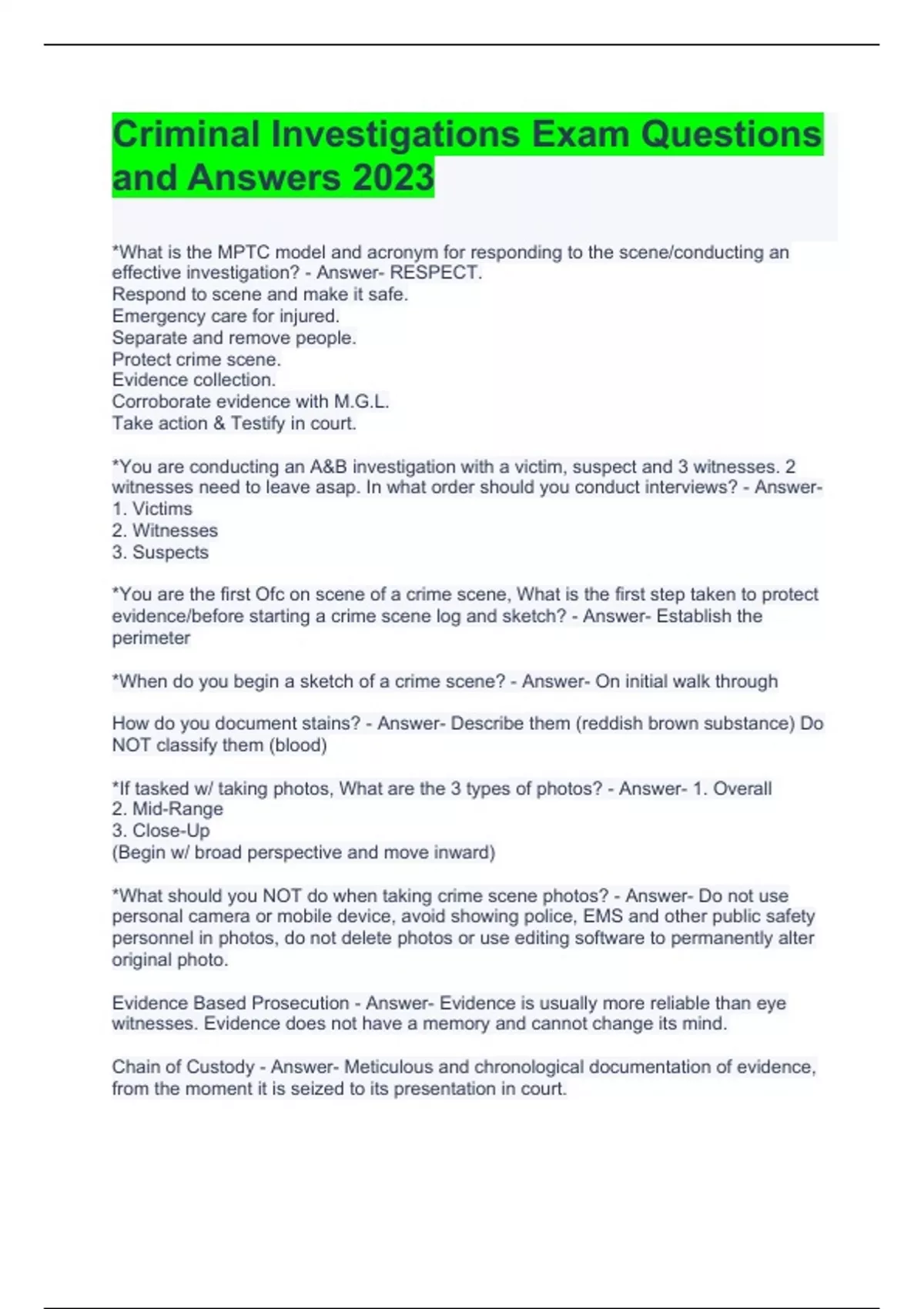 Criminal Investigations Exam Questions and Answers 2023