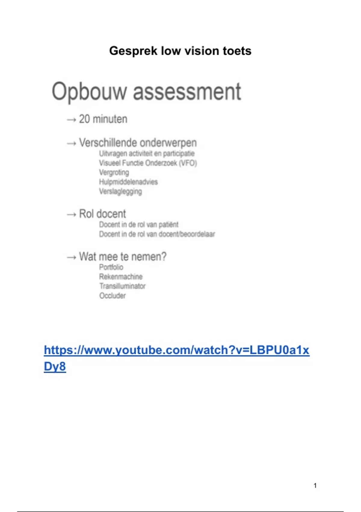 Deze samenvatting bevat alle informatie die je moet kennen voor het low vision gesprek, waardoor je alleen dit hoeft te leren voor de toets. Het is gemaakt obv het toetsformulier. Alle stappen die op canvas staan zijn uitgewerkt.